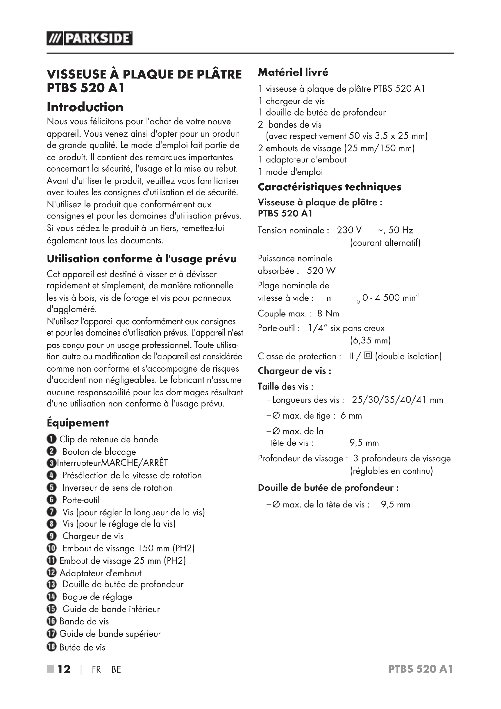 PTBS 520 A1 Introduction Nous vous félicitons pour l'achat de votre nouvel appareil. Vous venez ainsi d'opter pour un produit de grande qualité. Le mode d'emploi fait partie de ce produit. Il contient des remarques importantes concernant la sécurité, l'usage et la mise au rebut. Avant d'utiliser le produit, veuillez vous familiariser avec toutes les consignes d'utilisation et de sécurité. N'utilisez le produit que conformément aux consignes et pour les domaines d'utilisation prévus. Si vous cédez le produit à un tiers, remettez-lui également tous les documents. Utilisation conforme à l'usage prévu Cet appareil est destiné à visser et à dévisser rapidement et simplement, de manière rationnelle les vis à bois, vis de forage et vis pour panneaux d'aggloméré. N'utilisez l'appareil que conformément aux consignes et pour les domaines d'utilisation prévus. L'appareil n'est pas conçu pour un usage professionnel. Toute utilisa- tion autre ou modification de l'appareil est considérée comme non conforme et s'accompagne de risques d'accident non négligeables. Le fabricant n'assume aucune responsabilité pour les dommages résultant d'une utilisation non conforme à l'usage prévu. Équipement Clip de retenue de bande Bouton de blocage Interrupteur MARCHE/ARRÊT Présélection de la vitesse de rotation Inverseur de sens de rotation Porte-outil Vis (pour régler la longueur de la vis) Vis (pour le réglage de la vis) Chargeur de vis Embout de vissage 150 mm (PH2) Embout de vissage 25 mm (PH2) Adaptateur d'embout Douille de butée de profondeur Bague de réglage Guide de bande inférieur Bande de vis Guide de bande supérieur Butée de vis Matériel livré 1 visseuse à plaque de plâtre PTBS 520 A1 1 chargeur de vis 1 douille de butée de profondeur 2 bandes de vis (avec respectivement 50 vis 3,5 x 25 mm) 2 embouts de vissage (25 mm/150 mm) 1 adaptateur d'embout 1 mode d'emploi Caractéristiques techniques Visseuse à plaque de plâtre : PTBS 520 A1 Tension nominale: 230 V