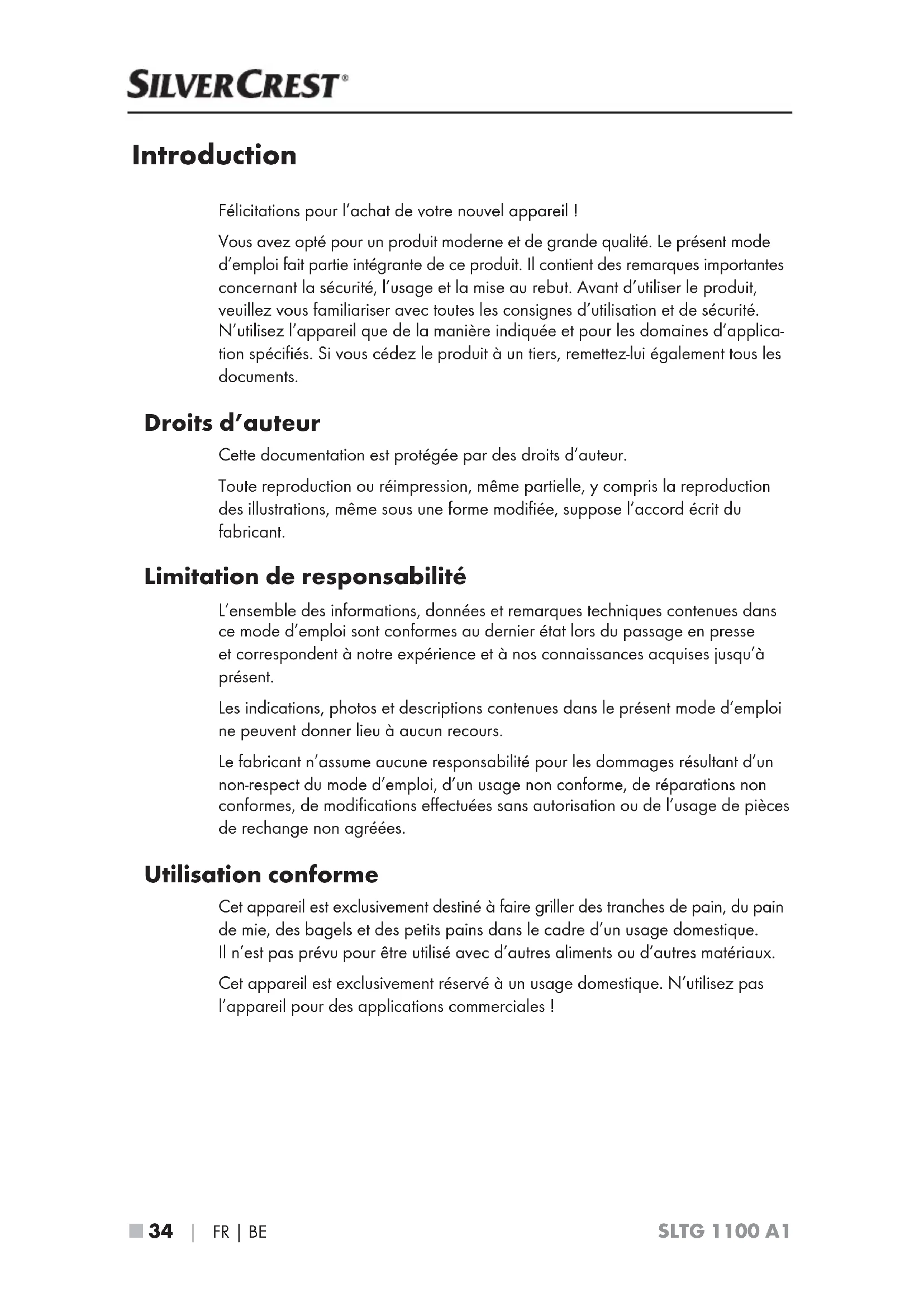 - Importateur SLTG 1100 A1 ■ 34 │ FR│BE Introduction Félicitations pour l’achat de votre nouvel appareil! Vous avez opté pour un produit moderne et de grande qualité. Le présent mode d’emploi fait partie intégrante de ce produit. Il contient des remarques importantes concernant la sécurité, l’usage et la mise au rebut. Avant d’utiliser le produit, veuillez vous familiariser avec toutes les consignes d’utilisation et de sécurité. N’utilisez l’appareil que de la manière indiquée et pour les domaines d’applica- tion spécifiés. Si vous cédez le produit à un tiers, remettez-lui également tous les documents. Droits d’auteur Cette documentation est protégée par des droits d’auteur. Toute reproduction ou réimpression, même partielle, y compris la reproduction des illustrations, même sous une forme modifiée, suppose l’accord écrit du fabricant. Limitation de responsabilité L’ensemble des informations, données et remarques techniques contenues dans ce mode d’emploi sont conformes au dernier état lors du passage en presse et correspondent à notre expérience et à nos connaissances acquises jusqu’à présent. Les indications, photos et descriptions contenues dans le présent mode d’emploi ne peuvent donner lieu à aucun recours. Le fabricant n’assume aucune responsabilité pour les dommages résultant d’un non-respect du mode d’emploi, d’un usage non conforme, de réparations non conformes, de modifications effectuées sans autorisation ou de l’usage de pièces de rechange non agréées. Utilisation conforme Cet appareil est exclusivement destiné à faire griller des tranches de pain, du pain de mie, des bagels et des petits pains dans le cadre d’un usage domestique. Il n’est pas prévu pour être utilisé avec d’autres aliments ou d’autres matériaux. Cet appareil est exclusivement réservé à un usage domestique. N’utilisez pas l’appareil pour des applications commerciales!SLTG 1100 A1 FR│BE │ 35 ■ Matériel livré L’appareil est livré équipé de série des composants suivants: ▯ Grille-pain fente longue ▯ Support à petits pains ▯ Mode d’emploi p. 47
