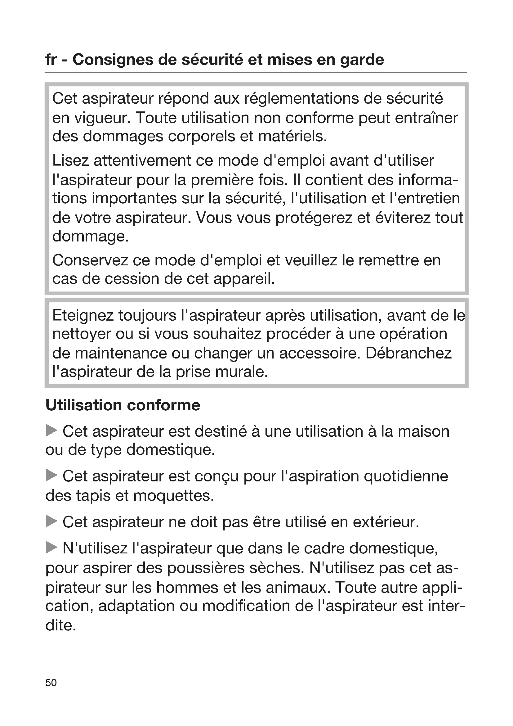 N'utilisez l'aspirateur que dans le cadre domestique, pour aspirer des poussières sèches. N'utilisez pas cet aspirateur sur les hommes et les animaux. Toute autre application, adaptation ou modification de l'aspirateur est interdite.
