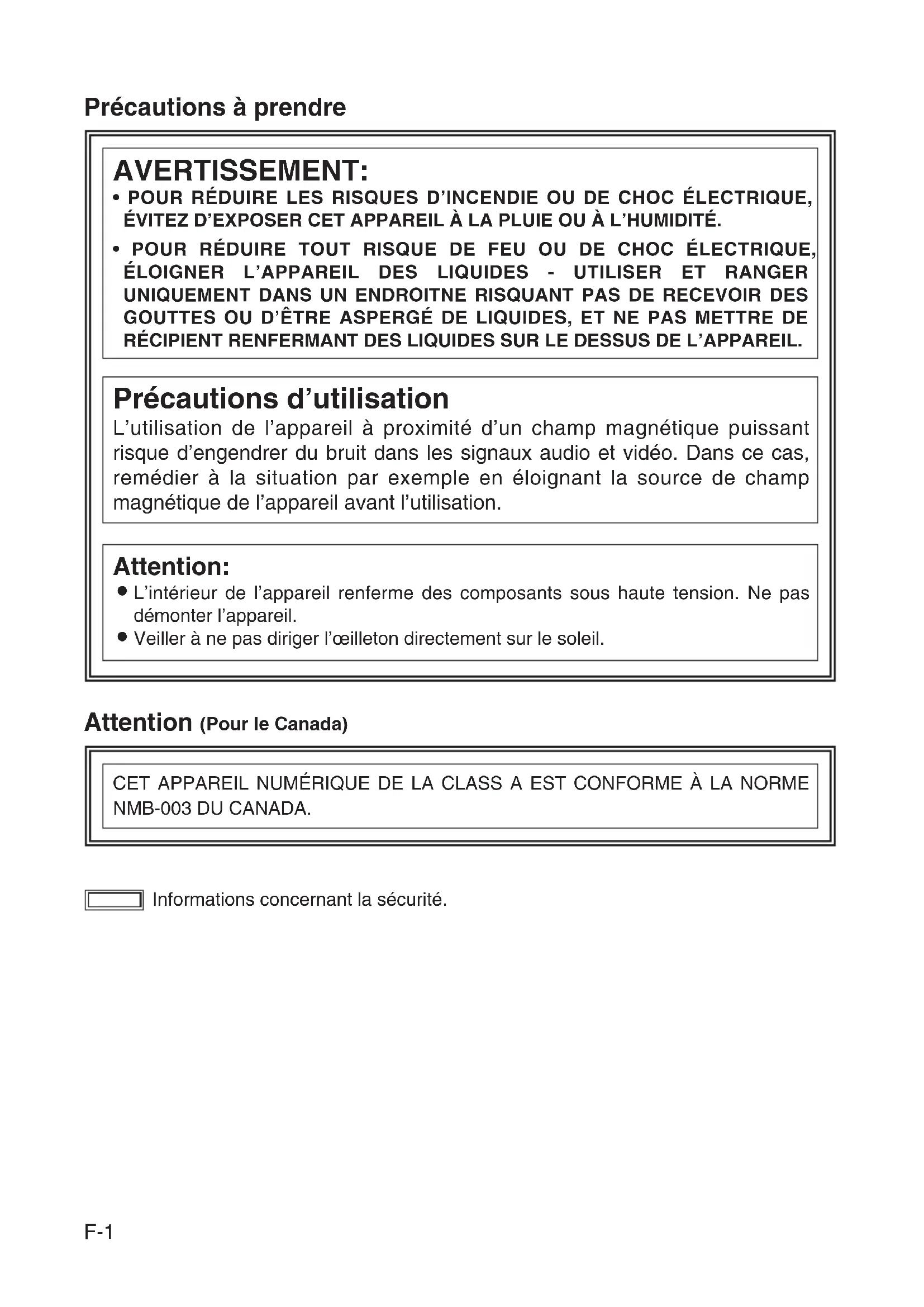 Veiller à ne pas diriger l’œilleton directement sur le soleil. Précautions d’utilisation L’utilisation de l’appareil à proximité d’un champ magnétique puissant risque d’engendrer du bruit dans les signaux audio et vidéo. Dans ce cas, remédier à la situation par exemple en éloignant la source de champ magnétique de l’appareil avant l’utilisation. CET APPAREIL NUMÉRIQUE DE LA CLASS A EST CONFORME À LA NORME NMB-003 DU CANADA. Informations concernant la sécurité. Précautions à prendre Attention (Pour le Canada)