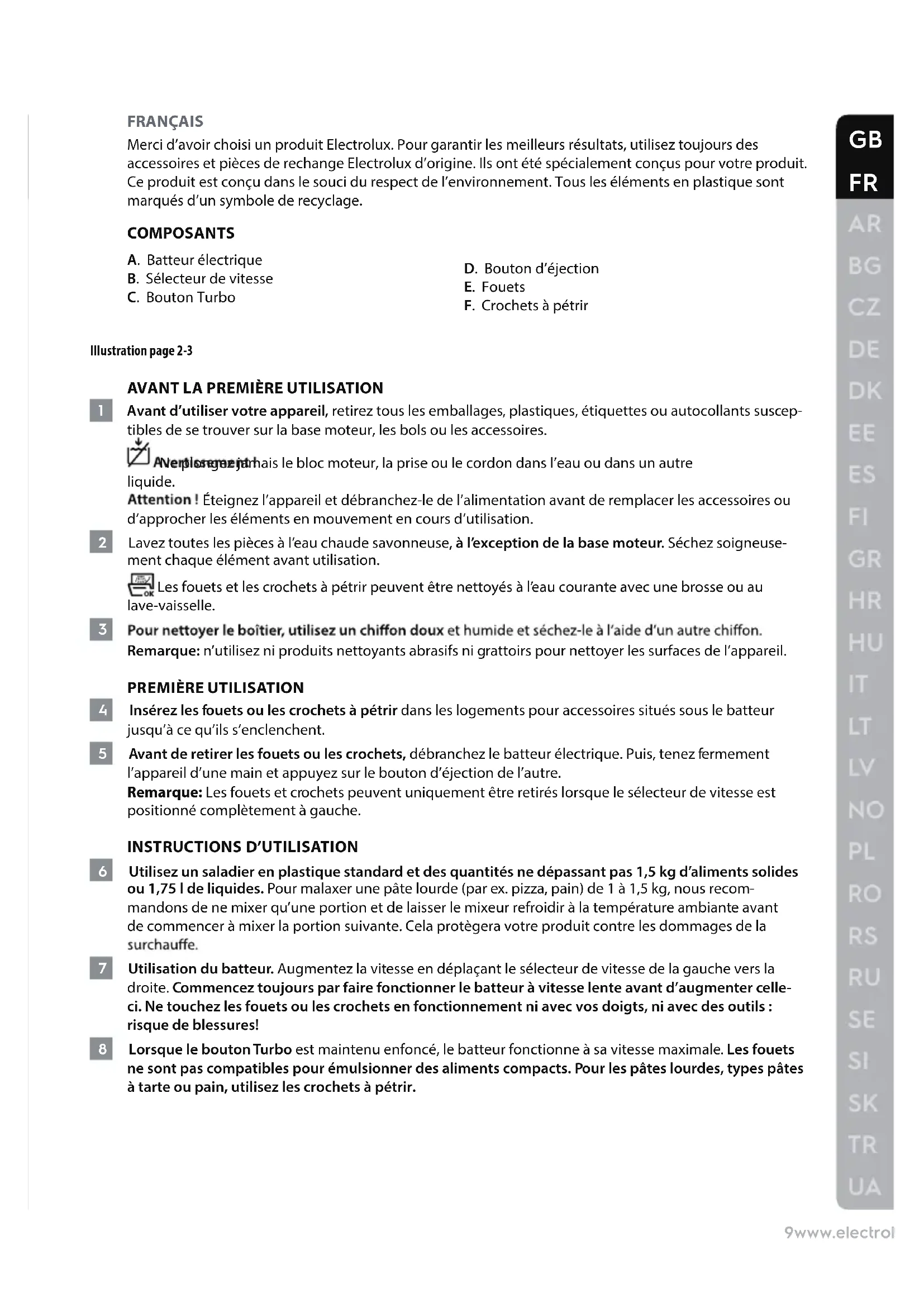 FRANÇAIS Merci d’avoir choisi un produit Electrolux. Pour garantir les meilleurs résultats, utilisez toujours des accessoires et pièces de rechange Electrolux d’origine. Ils ont été spécialement conçus pour votre produit. Ce produit est conçu dans le souci du respect de l’environnement. Tous les éléments en plastique sont marqués d’un symbole de recyclage. COMPOSANTS A. Batteur électrique B. Sélecteur de vitesse C. Bouton Turbo D. Bouton d’éjection E. Fouets F. Crochets à pétrir Illustration page 2-3