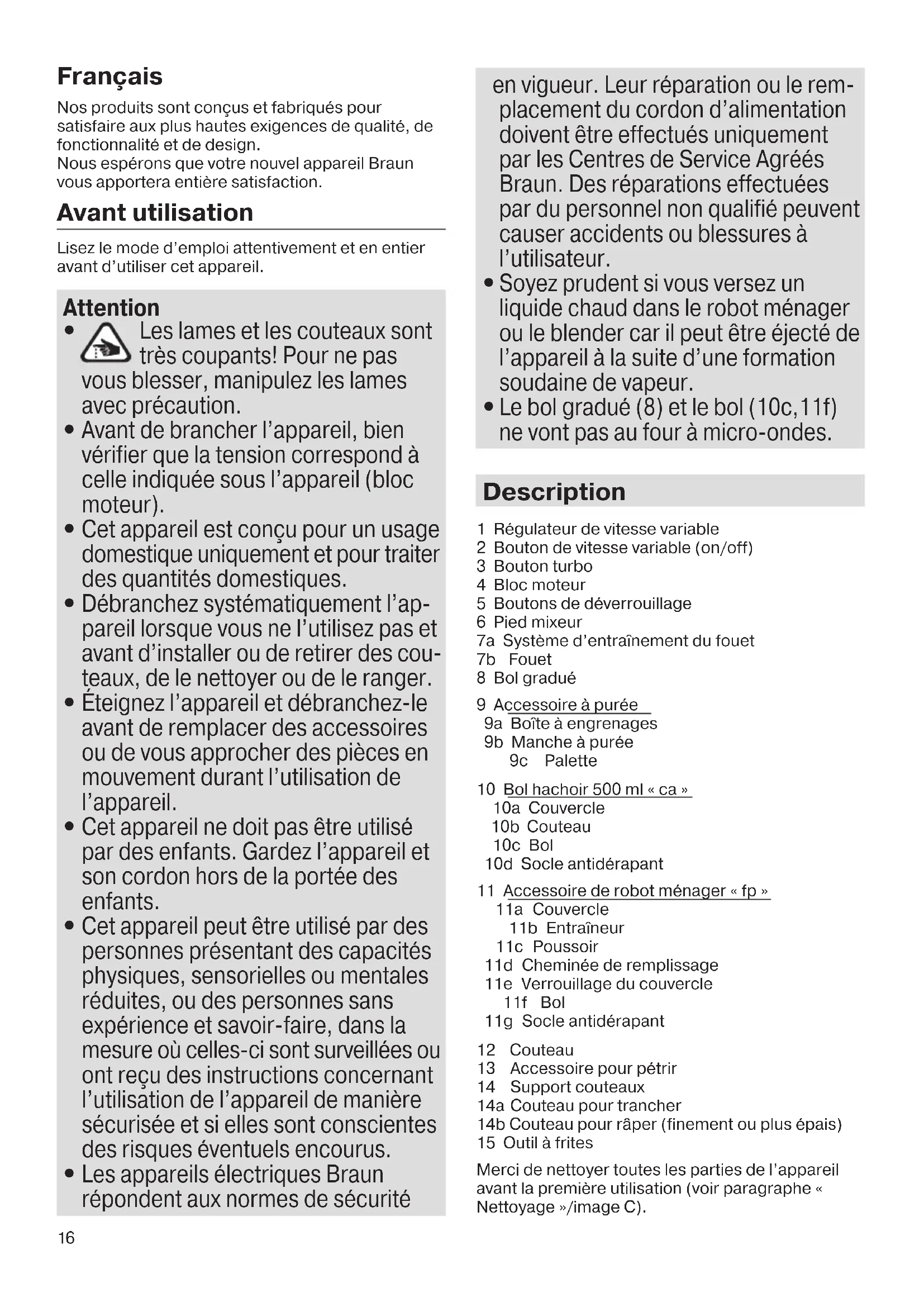 Les appareils électriques Braun répondent aux normes de sécurité en vigueur. Leur réparation ou le rem- placement du cordon d’alimentation doivent être effectués uniquement par les Centres de Service Agréés Braun. Des réparations effectuées par du personnel non qualifié peuvent causer accidents ou blessures à l’utilisateur.