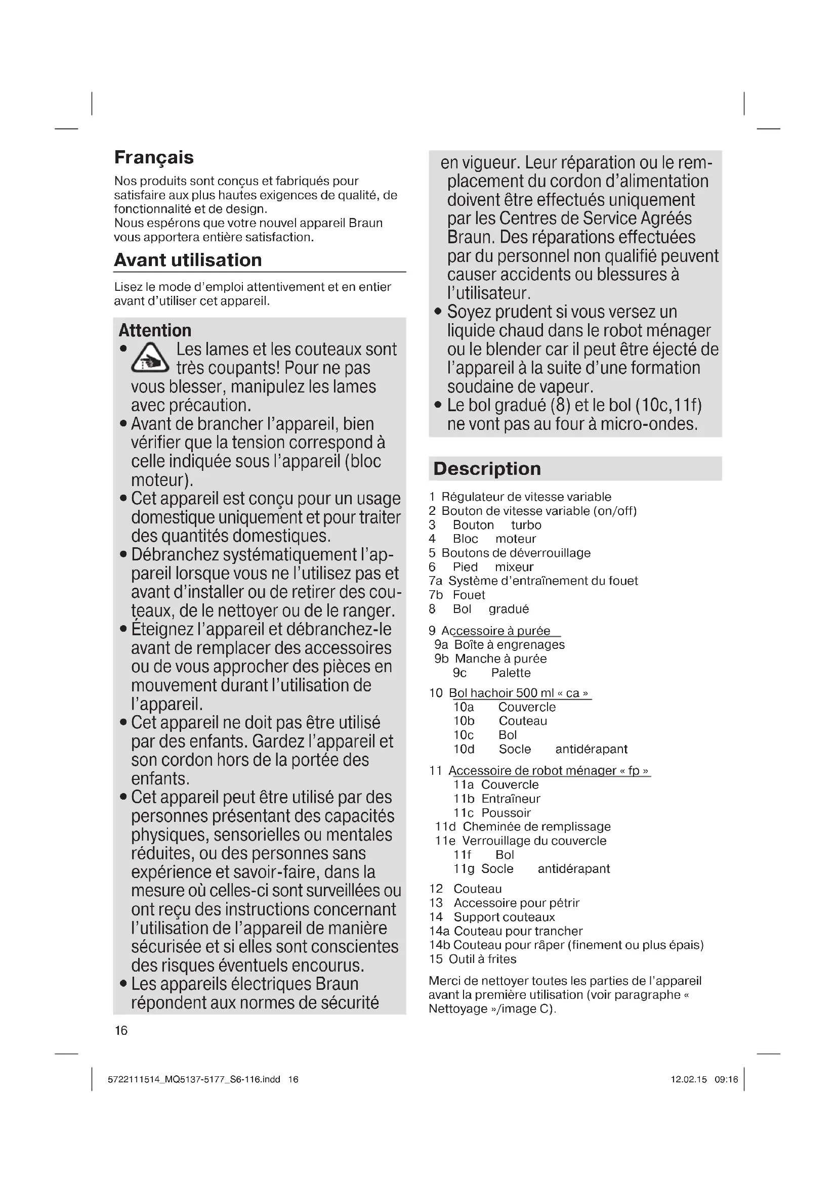 - Écrasez à nouveau pendant environ 30 s Nettoyage (C) Nettoyez l’organe moteur (4) et les boîtes à engrenages (7a, 9a) en utilisant seulement un chiffon humide. Les couvercles peuvent être nettoyés sous l’eau courante mais ils ne doivent ni être immergés dans l’eau ni nettoyés dans un lave-vaisselle. Toutes les autres pièces peuvent être nettoyées dans un lave-vaisselle. Si des aliments ont séché sur l’accessoire à purée, retirez la palette. Laissez tremper la palette et la partie inférieure du manche de l’accessoire à purée dans de l’eau chaude afin de ramollir ces restes d’aliments, puis lavez soigneusement. 5722111514_MQ5137-5177_S6-116.indd 195722111514_MQ5137-5177_S6-116.indd 19 12.02.15 09:1612.02.15 09:1620 Vous pouvez retirer les socles antidérapants des bols hachoirs pour un meilleur nettoyage. Si vous utilisez le mixeur pour la préparation de légumes colorés (exemple : carottes), les parties en plastique de l’appareil peuvent être colorées. Dans ce cas, enduisez-les d’huile végétale avant de les nettoyer. Accessoires (peuvent être achetés séparément, pas disponibles dans tous les pays) MQ 10: Fouet pour battre la crème, les blancs d’œufs, les desserts réalisés à base de préparations. MQ 20: Hachoir de 350 ml pour hacher les herbes, les oignons, l’ail, noisettes etc. MQ 30: Hachoir de 500 ml pour hacher les carottes, la viande, les oignons, etc. MQ 40: Hachoir de 1250 ml pour hacher, mixer et piler la glace MQ 50: Accessoire à purée pour réduire en purée les pommes de terre et les légumes cuits MQ 70: Accessoire de robot ménager pour hacher, mélanger, pétrir et broyer Sujet à modification sans préavis. A la fin de vie de votre appareil, veuillez ne pas le jeter avec vos déchets ménagers. Remettez-le à votre centre Service Agréé Braun ou déposez-le dans les sites de récupération appropriés conformément aux réglementations locales ou nationales en vigueur. 5722111514_MQ5137-5177_S6-116.indd 205722111514_MQ5137-5177_S6-116.indd 20 12.02.15 09:1612.02.15 09:1621 Español Nuestros productos han sido diseñados para satisfacer los más altos estándares de calidad, funcionalidad y diseño. Esperamos que disfrute plenamente de su nueva batidora Braun. Antes de usar Por favor, lea detenida e íntegramente las instrucciones antes de usar la batidora. ¡Cuidado!