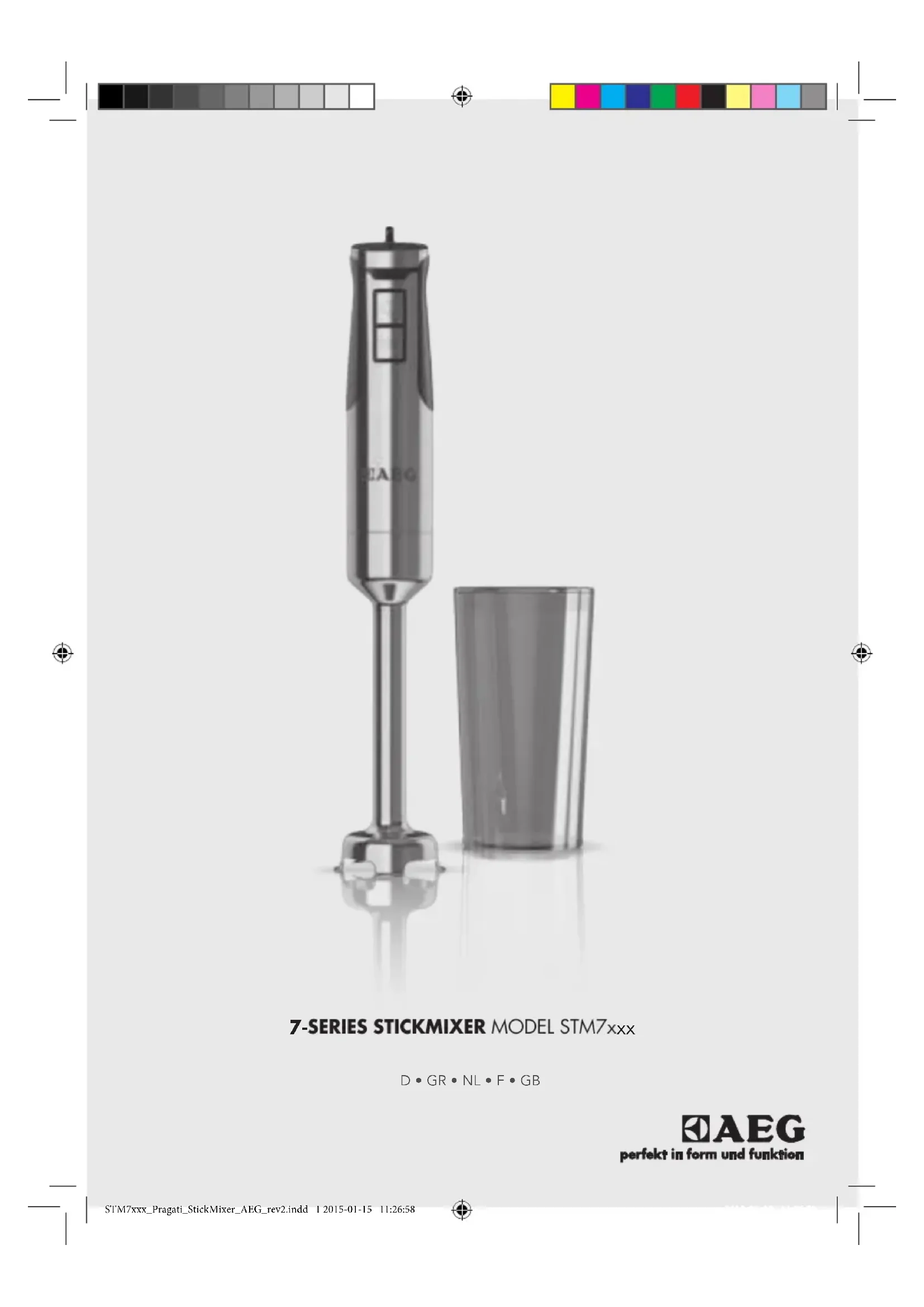 le récipient, puis commencer à mixer à vitesse normale. Veillez à ce que le récipient gradué ne soit pas rempli au delà des 2/3 (600 ml) de sa capacité. Si vous utilisez un autre récipient que celui fourni, veillez à ne pas immerger le pied mixeur au delà des 2/3 de sa longueur. Appliquer au mixeur plongeant un léger mouvement de va et vient vertical pour s'assurer du meilleur mixage du contenu. Relâcher le bouton pour l'arrêter. STM7xxx_Pragati_StickMixer_AEG_rev2.indd 8 2015-01-15 11:27:00*modellabhängig *εξαρτάται από το μοντέλο * afhankelijk van het model. *selon le modèle Verwenden des Mini-Zerkleinerers* /