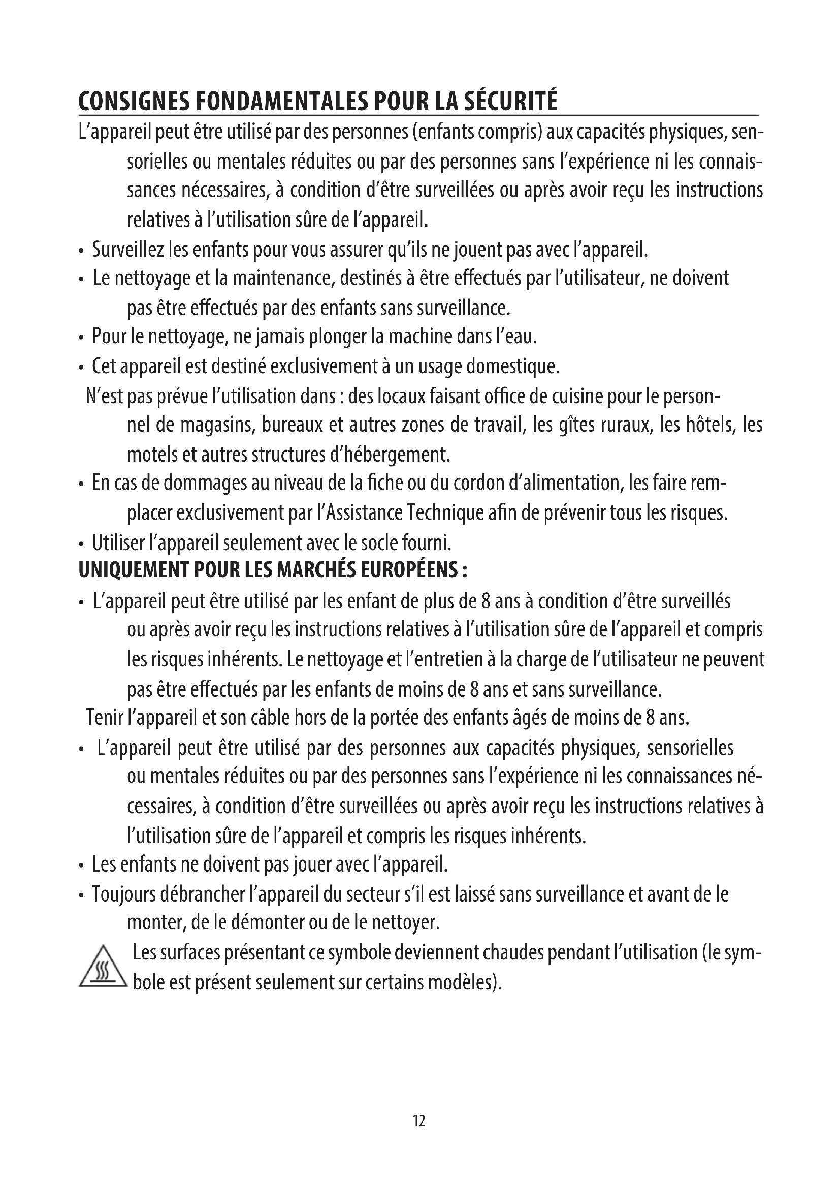 - Pendant l’utilisation ne touchez pas les surfaces chaudes de l’appareil. Utilisez les touches ou les poignées.