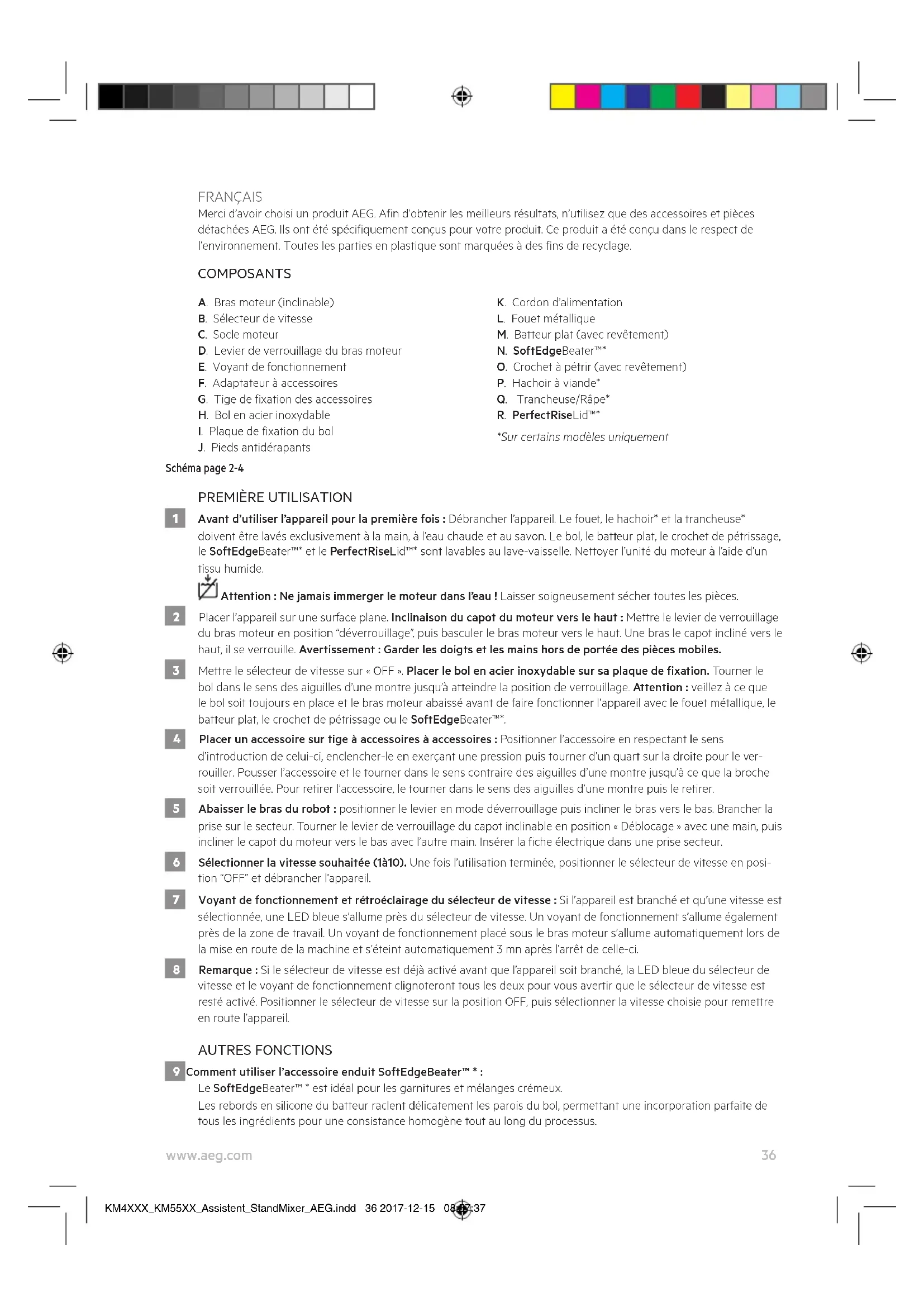 - Cet appareil est destiné à un usage domestique uniquement. Le fabricant décline toute responsabilité en cas de dommages résultant d’une utilisation incorrecte ou inadaptée de l’appareil. KM4XXX_KM55XX_Assistent_StandMixer_AEG.indd 38 2017-12-15 08:57:3739 www.aeg.com