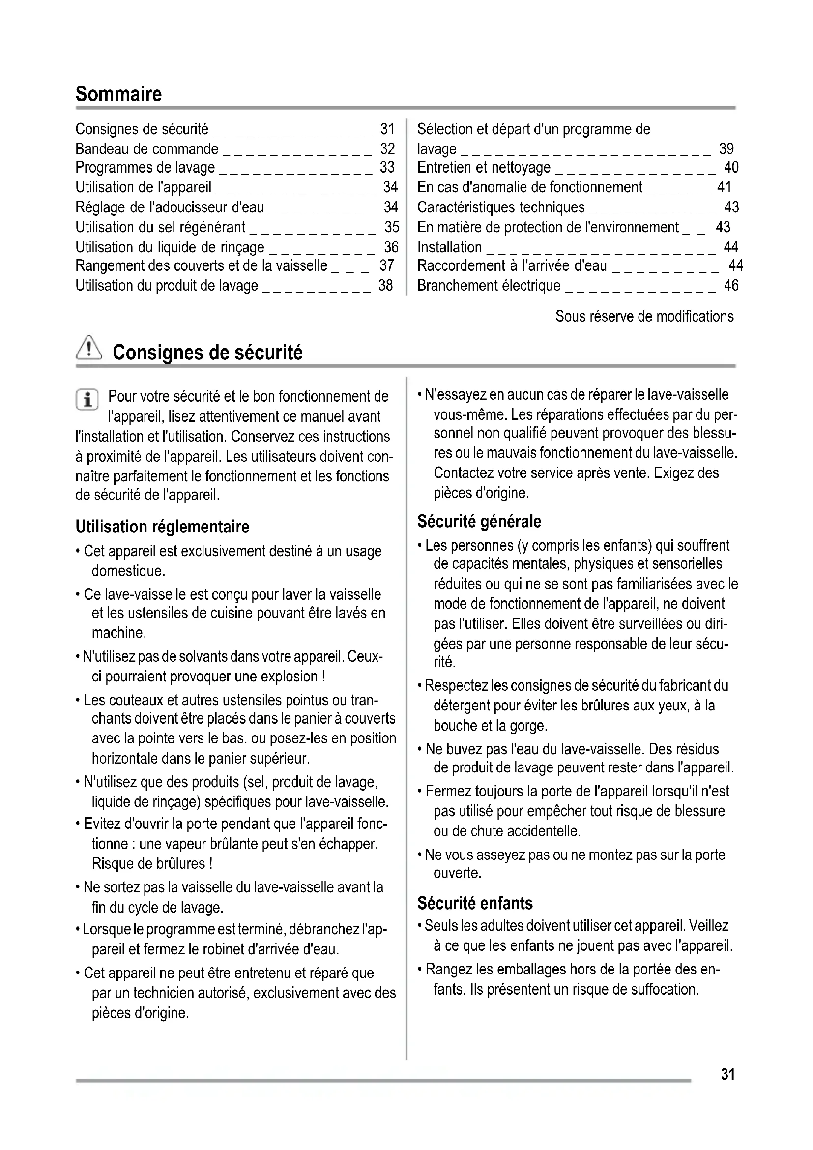 - N'essayez en aucun cas de réparer le lave-vaisselle vous-même. Les réparations effectuées par du per- sonnel non qualifié peuvent provoquer des blessu- res ou le mauvais fonctionnement du lave-vaisselle. Contactez votre service après vente. Exigez des pièces d'origine. Sécurité générale