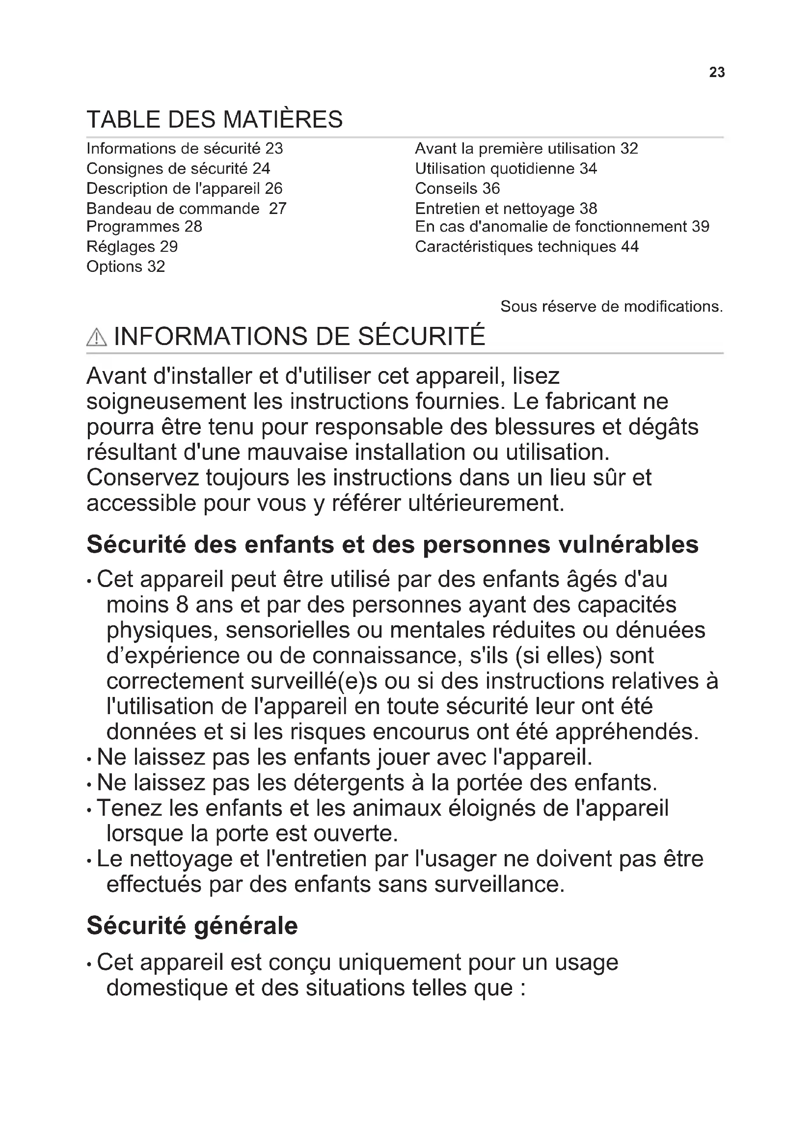 Informations de sécurité 23 Consignes de sécurité 24 Description de l'appareil 26 Bandeau de commande 27 Programmes 28 Réglages 29 Options 32 Avant la première utilisation 32 Utilisation quotidienne 34 Conseils 36 Entretien et nettoyage 38 En cas d'anomalie de fonctionnement 39 Caractéristiques techniques 44 Sous réserve de modifications.
