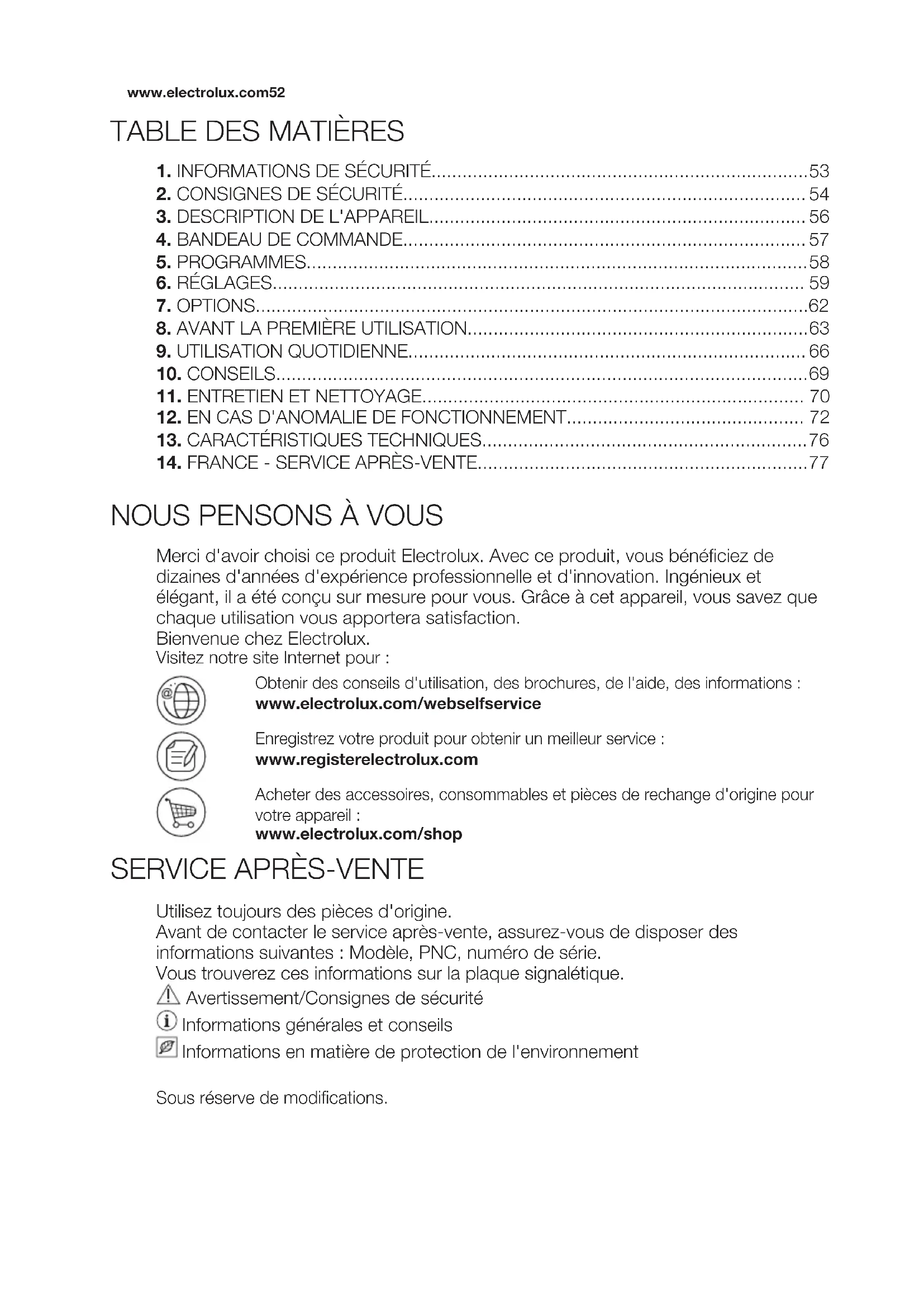 Merci d'avoir choisi ce produit Electrolux. Avec ce produit, vous bénéficiez de dizaines d'années d'expérience professionnelle et d'innovation. Ingénieux et élégant, il a été conçu sur mesure pour vous. Grâce à cet appareil, vous savez que chaque utilisation vous apportera satisfaction. Bienvenue chez Electrolux. Visitez notre site Internet pour : Obtenir des conseils d'utilisation, des brochures, de l'aide, des informations : www.electrolux.com/webselfservice Enregistrez votre produit pour obtenir un meilleur service : www.registerelectrolux.com Acheter des accessoires, consommables et pièces de rechange d'origine pour votre appareil : www.electrolux.com/shop
