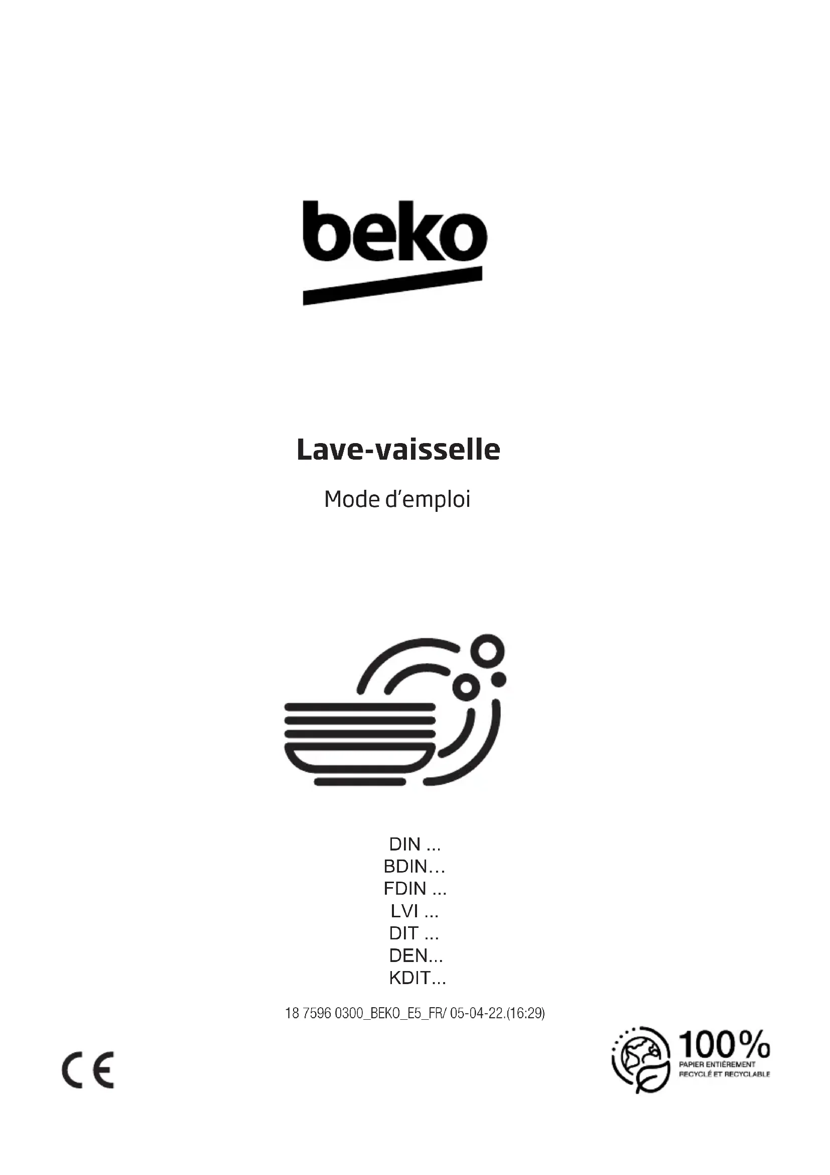 - KDIT 7596 0300_BEKO_E5_FR/ 05-04-22.(16:29)Les symboles suivants sont utilisés dans le manuel d’utilisation et sur l’emballage : Danger pouvant entraîner des blessures voire la mort. AVIS Danger pouvant entraîner des dommages au produit ou à son environnement. Informations importantes ou conseils utiles pour l’utilisation Veuillez lire ce manuel d’utilisateur. Cher client, Veuillez lire le présent manuel d’utilisation avant d’utiliser le produit. Merci d’avoir choisi ce produit Beko. Nous espérons que vous obtiendrez les meilleurs résultats avec notre produit fabriqué à partir d’une technologie de pointe et de matériaux de qualité supérieure. C’est pourquoi nous vous recommandons, avant d’utiliser ce produit, de lire attentivement ce manuel et tous les autres documents fournis. Veillez à bien respecter les consignes et les instructions figurant dans le manuel d’utilisation. Ainsi, vous pouvez vous protéger et protéger votre produit contre les dangers potentiels. Veuillez conserver ce manuel d’utilisateur. Si vous confiez le produit à quelqu’un d’autre, n’oubliez pas de lui remettre également le manuel d’utilisation. Ce produit a été fabriqué conformément aux conditions écologiques les plus récentes.TABLE DES MATIÈRES p. 18