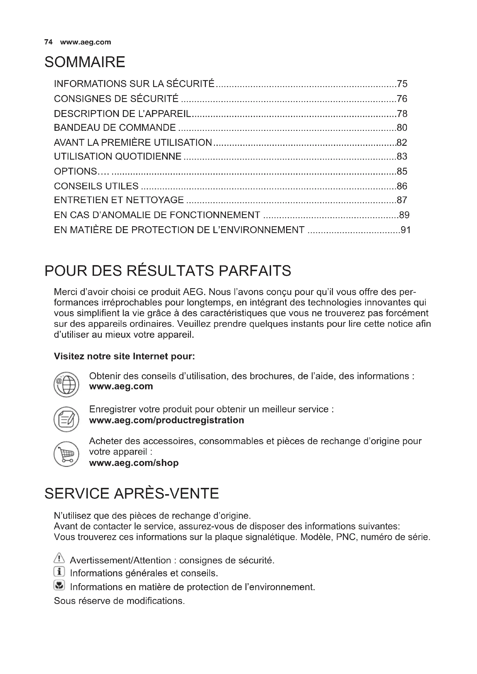 N’utilisez que des pièces de rechange d’origine. Avant de contacter le service, assurez-vous de disposer des informations suivantes: Vous trouverez ces informations sur la plaque signalétique. Modèle, PNC, numéro de série. Avertissement/Attention : consignes de sécurité. Informations générales et conseils. Informations en matière de protection de l’environnement. Sous réserve de modications.
