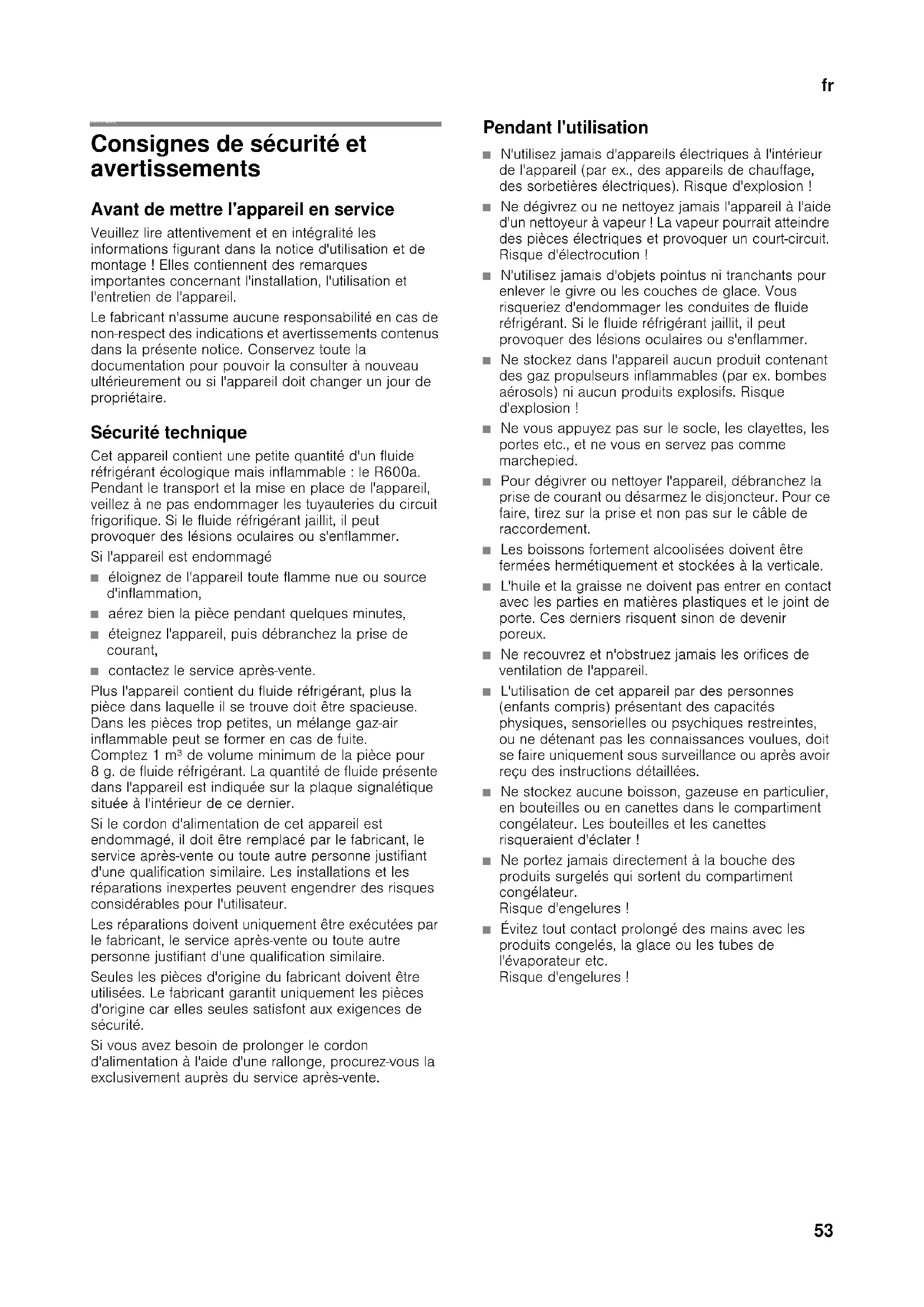 frTable des matières frNotice d'utilisation Consignes de sécurité et avertissements Avant de mettre l'appareil en service Veuillez lire attentivement et en intégralité les informations figurant dans la notice d'utilisation et de montage ! Elles contiennent des remarques importantes concernant l'installation, l'utilisation et l'entretien de l'appareil. Le fabricant n'assume aucune responsabilité en cas de non-respect des indications et avertissements contenus dans la présente notice. Conservez toute la documentation pour pouvoir la consulter à nouveau ultérieurement ou si l'appareil doit changer un jour de propriétaire. Sécurité technique Cet appareil contient une petite quantité d'un fluide réfrigérant écologique mais inflammable : le R600a. Pendant le transport et la mise en place de l'appareil, veillez à ne pas endommager les tuyauteries du circuit frigorifique. Si le fluide réfrigérant jaillit, il peut provoquer des lésions oculaires ou s'enflammer. Si l'appareil est endommagé ■ éloignez de l'appareil toute flamme nue ou source d'inflammation, ■ aérez bien la pièce pendant quelques minutes, ■ éteignez l'appareil, puis débranchez la prise de courant, ■ contactez le service après-vente. Plus l'appareil contient du fluide réfrigérant, plus la pièce dans laquelle il se trouve doit être spacieuse. Dans les pièces trop petites, un mélange gaz-air inflammable peut se former en cas de fuite. Comptez 1 m³ de volume minimum de la pièce pour 8 g. de fluide réfrigérant. La quantité de fluide présente dans l'appareil est indiquée sur la plaque signalétique située à l'intérieur de ce dernier. Si le cordon d'alimentation de cet appareil est endommagé, il doit être remplacé par le fabricant, le service après-vente ou toute autre personne justifiant d'une qualification similaire. Les installations et les réparations inexpertes peuvent engendrer des risques considérables pour l'utilisateur. Les réparations doivent uniquement être exécutées par le fabricant, le service après-vente ou toute autre personne justifiant d'une qualification similaire. Seules les pièces d'origine du fabricant doivent être utilisées. Le fabricant garantit uniquement les pièces d'origine car elles seules satisfont aux exigences de sécurité. Si vous avez besoin de prolonger le cordon d'alimentation à l'aide d'une rallonge, procurez-vous la exclusivement auprès du service après-vente. Pendant l'utilisation ■ N'utilisez jamais d'appareils électriques à l'intérieur de l'appareil (par ex., des appareils de chauffage, des sorbetières électriques). Risque d'explosion ! ■ Ne dégivrez ou ne nettoyez jamais l'appareil à l'aide d'un nettoyeur à vapeur ! La vapeur pourrait atteindre des pièces électriques et provoquer un court-circuit. Risque d'électrocution ! ■ N'utilisez jamais d'objets pointus ni tranchants pour enlever le givre ou les couches de glace. Vous risqueriez d'endommager les conduites de fluide réfrigérant. Si le fluide réfrigérant jaillit, il peut provoquer des lésions oculaires ou s'enflammer. ■ Ne stockez dans l'appareil aucun produit contenant des gaz propulseurs inflammables (par ex. bombes aérosols) ni aucun produits explosifs. Risque d'explosion ! ■ Ne vous appuyez pas sur le socle, les clayettes, les portes etc., et ne vous en servez pas comme marchepied. ■ Pour dégivrer ou nettoyer l'appareil, débranchez la prise de courant ou désarmez le disjoncteur. Pour ce faire, tirez sur la prise et non pas sur le câble de raccordement. ■ Les boissons fortement alcoolisées doivent être fermées hermétiquement et stockées à la verticale. ■ L'huile et la graisse ne doivent pas entrer en contact avec les parties en matières plastiques et le joint de porte. Ces derniers risquent sinon de devenir poreux. ■ Ne recouvrez et n'obstruez jamais les orifices de ventilation de l'appareil. ■ L'utilisation de cet appareil par des personnes (enfants compris) présentant des capacités physiques, sensorielles ou psychiques restreintes, ou ne détenant pas les connaissances voulues, doit se faire uniquement sous surveillance ou après avoir reçu des instructions détaillées. ■ Ne stockez aucune boisson, gazeuse en particulier, en bouteilles ou en canettes dans le compartiment congélateur. Les bouteilles et les canettes risqueraient d'éclater ! ■ Ne portez jamais directement à la bouche des produits surgelés qui sortent du compartiment congélateur. Risque d'engelures ! ■ Évitez tout contact prolongé des mains avec les produits congelés, la glace ou les tubes de l'évaporateur etc. Risque d'engelures !fr
