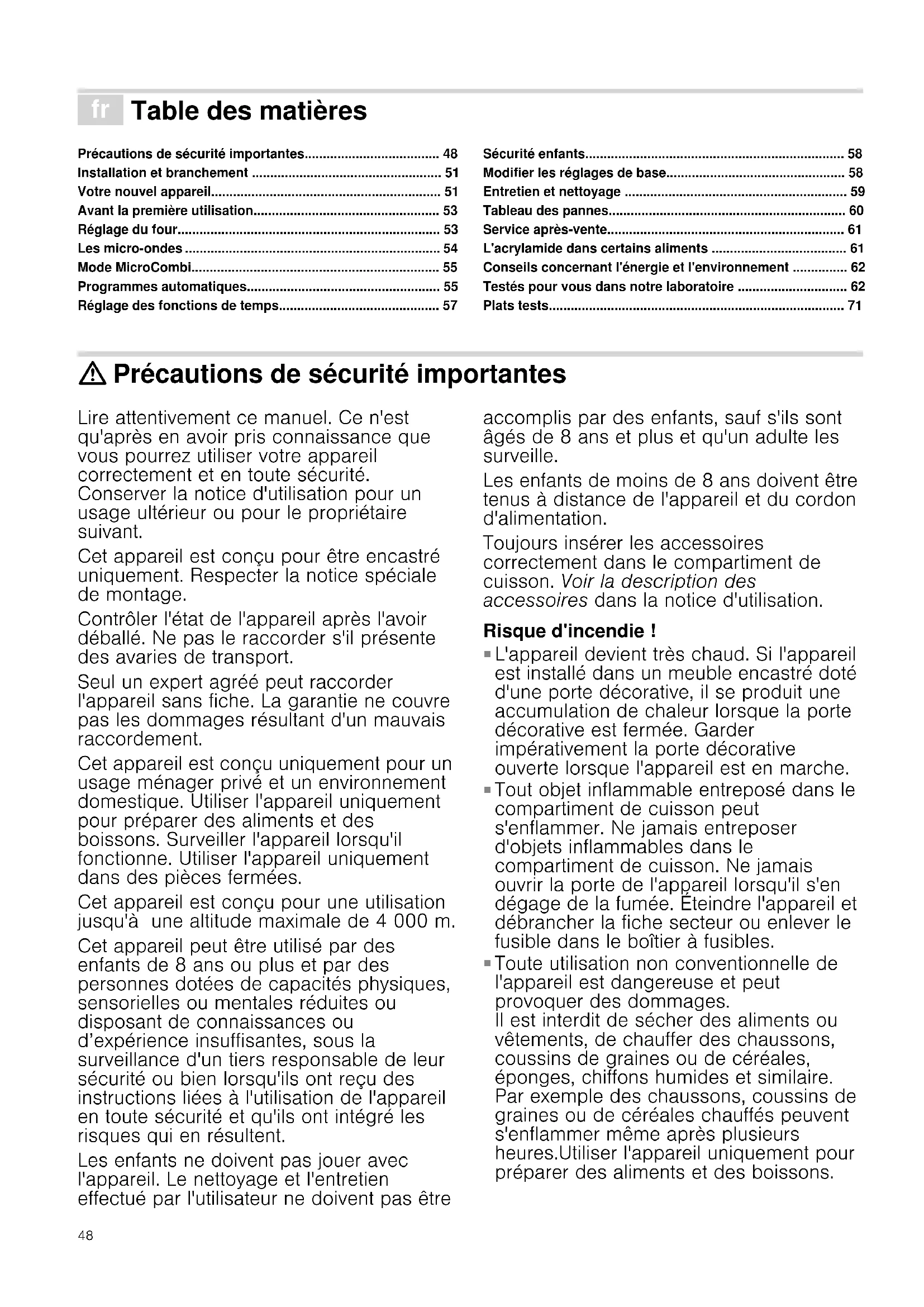 - Plats tests : Précautions de sécurité importantes Lire attentivement ce manuel. Ce n'est qu'après en avoir pris connaissance que vous pourrez utiliser votre appareil correctement et en toute sécurité. Conserver la notice d'utilisation pour un usage ultérieur ou pour le propriétaire suivant. Cet appareil est conçu pour être encastré uniquement. Respecter la notice spéciale de montage. Contrôler l'état de l'appareil après l'avoir déballé. Ne pas le raccorder s'il présente des avaries de transport. Seul un expert agréé peut raccorder l'appareil sans fiche. La garantie ne couvre pas les dommages résultant d'un mauvais raccordement. Cet appareil est conçu uniquement pour un usage ménager privé et un environnement domestique. Utiliser l'appareil uniquement pour préparer des aliments et des boissons. Surveiller l'appareil lorsqu'il fonctionne. Utiliser l'appareil uniquement dans des pièces fermées. Cet appareil est conçu pour une utilisation jusqu'à une altitude maximale de 4 000 m. Cet appareil peut être utilisé par des enfants de 8 ans ou plus et par des personnes dotées de capacités physiques, sensorielles ou mentales réduites ou disposant de connaissances ou d’expérience insuffisantes, sous la surveillance d'un tiers responsable de leur sécurité ou bien lorsqu'ils ont reçu des instructions liées à l'utilisation de l'appareil en toute sécurité et qu'ils ont intégré les risques qui en résultent. Les enfants ne doivent pas jouer avec l'appareil. Le nettoyage et l'entretien effectué par l'utilisateur ne doivent pas être accomplis par des enfants, sauf s'ils sont âgés de 8 ans et plus et qu'un adulte les surveille. Les enfants de moins de 8 ans doivent être tenus à distance de l'appareil et du cordon d'alimentation. Toujours insérer les accessoires correctement dans le compartiment de cuisson. Voir la description des accessoires dans la notice d'utilisation. Risque d'incendie ! p. 71