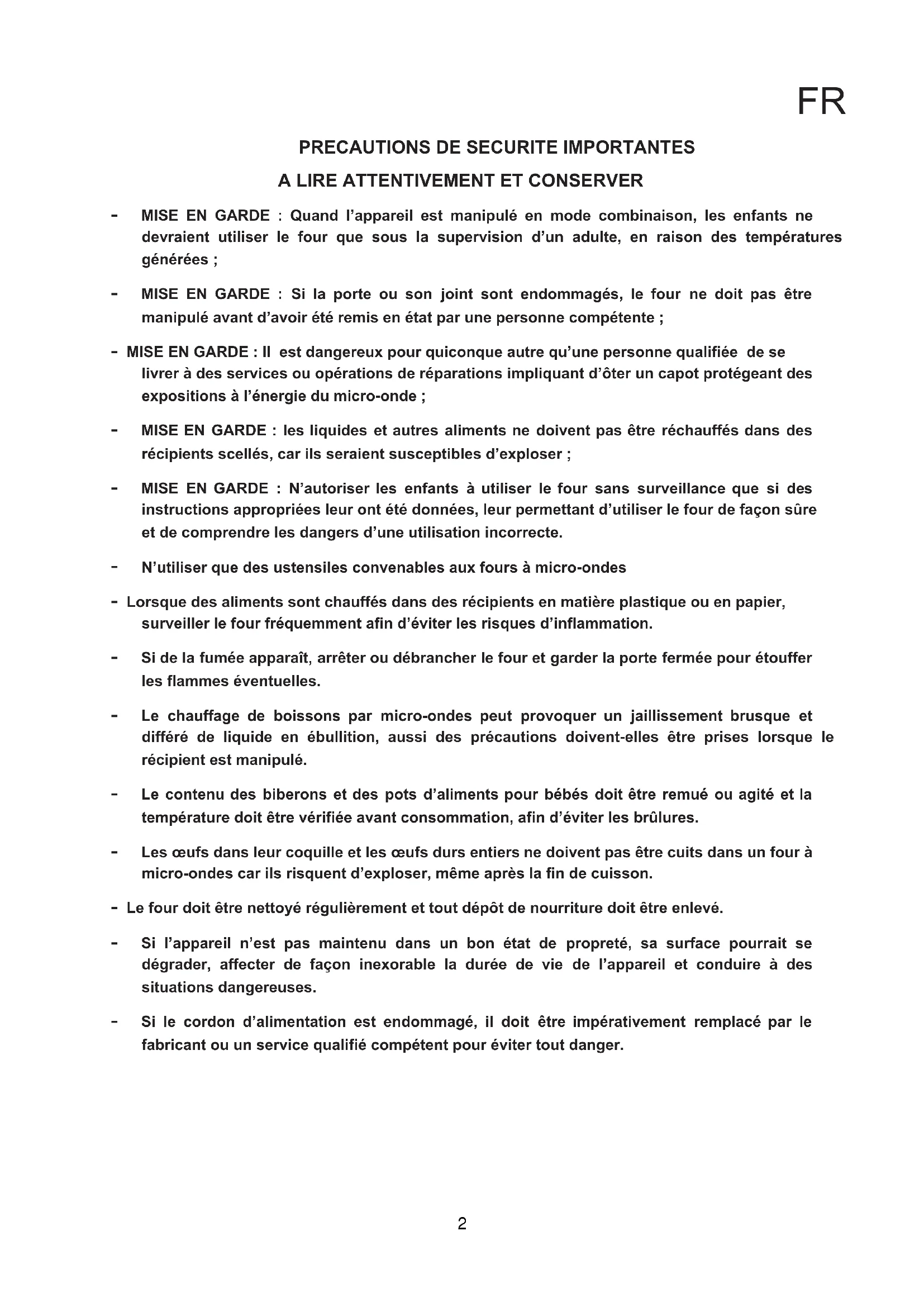 - MISE EN GARDE : Quand l’appareil est manipulé en mode combinaison, les enfants ne devraient utiliser le four que sous la supervision d’un adulte, en raison des températures générées ; - MISE EN GARDE : Si la porte ou son joint sont endommagés, le four ne doit pas être manipulé avant d’avoir été remis en état par une personne compétente ; - MISE EN GARDE : Il est dangereux pour quiconque autre qu’une personne qualifiée de se livrer à des services ou opérations de réparations impliquant d’ôter un capot protégeant des expositions à l’énergie du micro-onde ; - MISE EN GARDE : les liquides et autres aliments ne doivent pas être réchauffés dans des récipients scellés, car ils seraient susceptibles d’exploser ; - MISE EN GARDE : N’autoriser les enfants à utiliser le four sans surveillance que si des instructions appropriées leur ont été données, leur permettant d’utiliser le four de façon sûre et de comprendre les dangers d’une utilisation incorrecte. - N’utiliser que des ustensiles convenables aux fours à micro-ondes - Lorsque des aliments sont chauffés dans des récipients en matière plastique ou en papier, surveiller le four fréquemment afin d’éviter les risques d’inflammation. - Si de la fumée apparaît, arrêter ou débrancher le four et garder la porte fermée pour étouffer les flammes éventuelles. - Le chauffage de boissons par micro-ondes peut provoquer un jaillissement brusque et différé de liquide en ébullition, aussi des précautions doivent-elles être prises lorsque le récipient est manipulé. - Le contenu des biberons et des pots d’aliments pour bébés doit être remué ou agité et la température doit être vérifiée avant consommation, afin d’éviter les brûlures. - Les œufs dans leur coquille et les œufs durs entiers ne doivent pas être cuits dans un four à micro-ondes car ils risquent d’exploser, même après la fin de cuisson. - Le four doit être nettoyé régulièrement et tout dépôt de nourriture doit être enlevé. - Si l’appareil n’est pas maintenu dans un bon état de propreté, sa surface pourrait se dégrader, affecter de façon inexorable la durée de vie de l’appareil et conduire à des situations dangereuses. - Si le cordon d’alimentation est endommagé, il doit être impérativement remplacé par le fabricant ou un service qualifié compétent pour éviter tout danger.