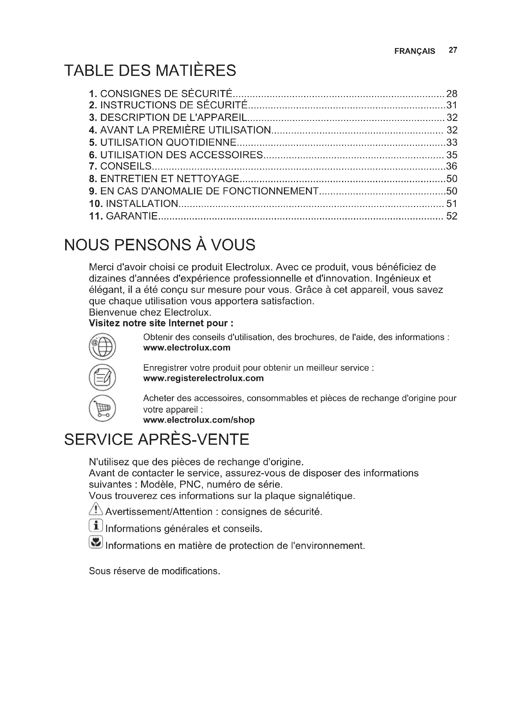 Merci d'avoir choisi ce produit Electrolux. Avec ce produit, vous bénéficiez de dizaines d'années d'expérience professionnelle et d'innovation. Ingénieux et élégant, il a été conçu sur mesure pour vous. Grâce à cet appareil, vous savez que chaque utilisation vous apportera satisfaction. Bienvenue chez Electrolux. Visitez notre site Internet pour : Obtenir des conseils d'utilisation, des brochures, de l'aide, des informations : www.electrolux.com Enregistrer votre produit pour obtenir un meilleur service : www.registerelectrolux.com Acheter des accessoires, consommables et pièces de rechange d'origine pour votre appareil : www.electrolux.com/shop
