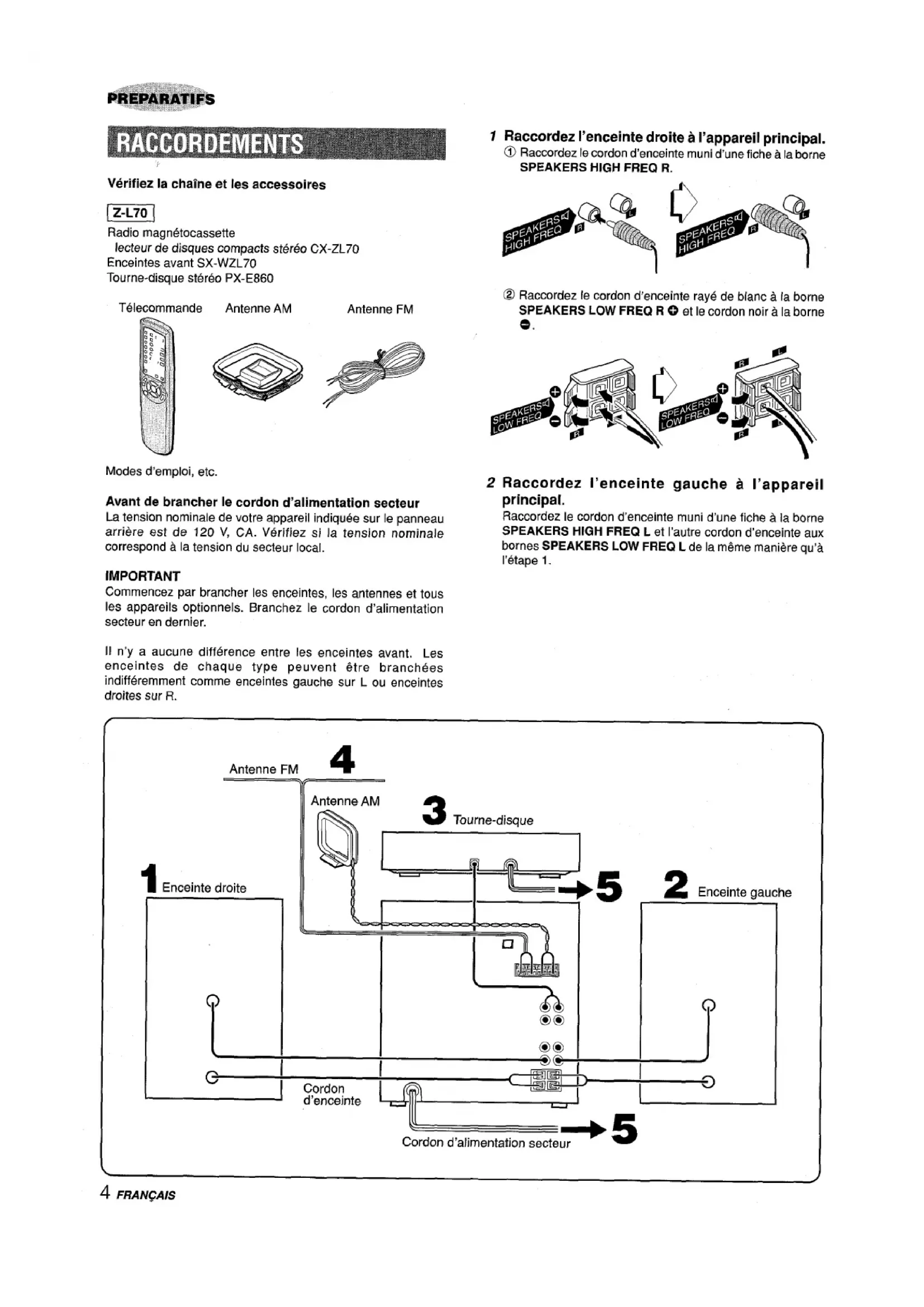 Radio magnetocassette Iecteur de disques compacts stereo CX-ZL70 Enceintes avant SX-WZL70Tourne-disque stereo PX-E860 e“Q ‘ey @ Raccordez Ie cordon d’enceinte raye de blanc a la borne Telecommande Antenne AMAntenne FM SPEAKERS LOW FREQ R () et Ie cordon noir a la borne Modes d’emploi, etc. 2 Raccordez I’enceinte gauche a I’appareil Avant de brancher Ie cordon d’alimentation secteur principal. La tension nominaie de votre appareil indiquee sur Ie panneau Raccordez Ie cordon d’enceinte muni d’une fiche a la borne arriere est de 120 V, CA. V&ifiez si la tension nominale SPEAKERS HIGH FREQ Let I’autre cordon d’enceinte aux correspond a la tension du secteur local. bornes SPEAKERS LOW FREQ L de la m6me maniere uu’a I’etape 1.IMPORTANT Commencez par brancher Ies enceintes, Ies antennes et tous Ies appareils optionnels. Branchez Ie cordon d’alimentation secteur en dernier. II n’y a aucune diff&ence entre Ies enceintes avant, Les enceintes de chaque type peuvent ~tre branchees indifferemment comme enceintes gauche sur L ou enceintes droites sur R.Antenne FM