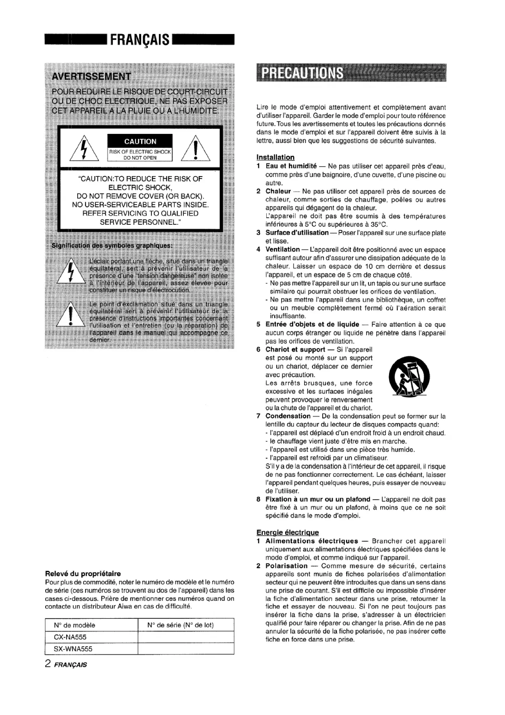 .%J;:.;. @4refixe a un mur ou un plafond, a rno;ns que ce ne koit specifie clans Ie mode d’emploi. Enerctie electriaue Releve cfu proprietaire Pour plLIsde commodite, rioter Ie numero de modele et Ie numero de serie (ces numeros se trouvent au dos de I’appareil) clans Ies cases ci-dessous. Priere de mentioner ces numeros quand on contacte un distributeur Aiwa en cas de difficult. Lire Ie mode d’emploi attentivement et complbtement avant d’utiliser I’appareil, Garder Ie mode d’emplc)i pour toute reference future. Tous Ies avertissements et toutes Ies precautions donnes clans Ie mode d’emploi et sur I’appareil doivent 6tre suivis a la, Iettre, aussi bien que Ies suggestions de securite suivantes. Installation