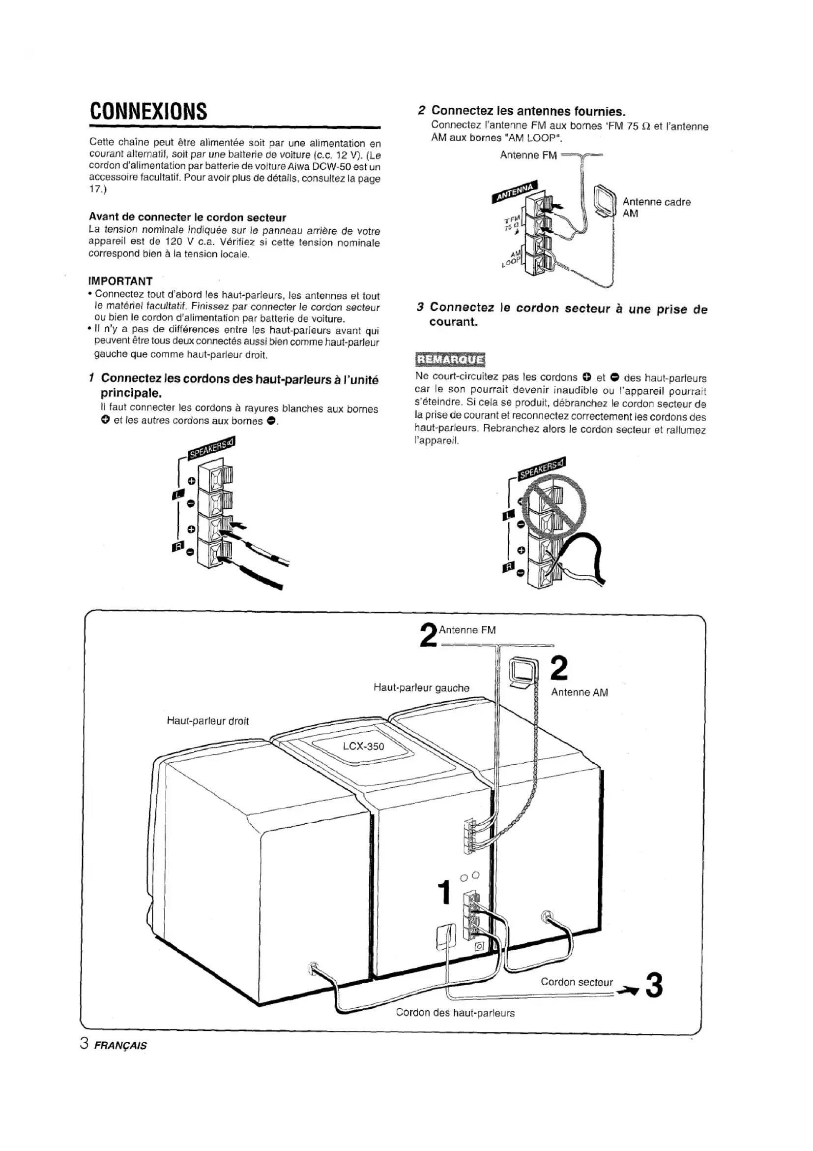 Cette chalne peut ~tre alimentee soit par une alimentation en courant alternatif, soit par une batterie de voiture (c.c. 12 V). (Le cordon d’alimentation par batterie de voiture Aiwa DCW-50 est un accessoire facultatif. Pour avoir plus de details, consultez la page 17.) Avant de connecter Ie cordon secteur La tension nominale indiquee sur Ie parrneau arriere de votre appareil est de 120 V c.a. Verifiez si cette tension nominale correspond bien a la tension locale. IMPORTANT ● Connectez tout d’abord Ies haut-parleurs, Ies antennes et tout Ie materiel facuttatif. Finissez par connecter Ie cordon secteur