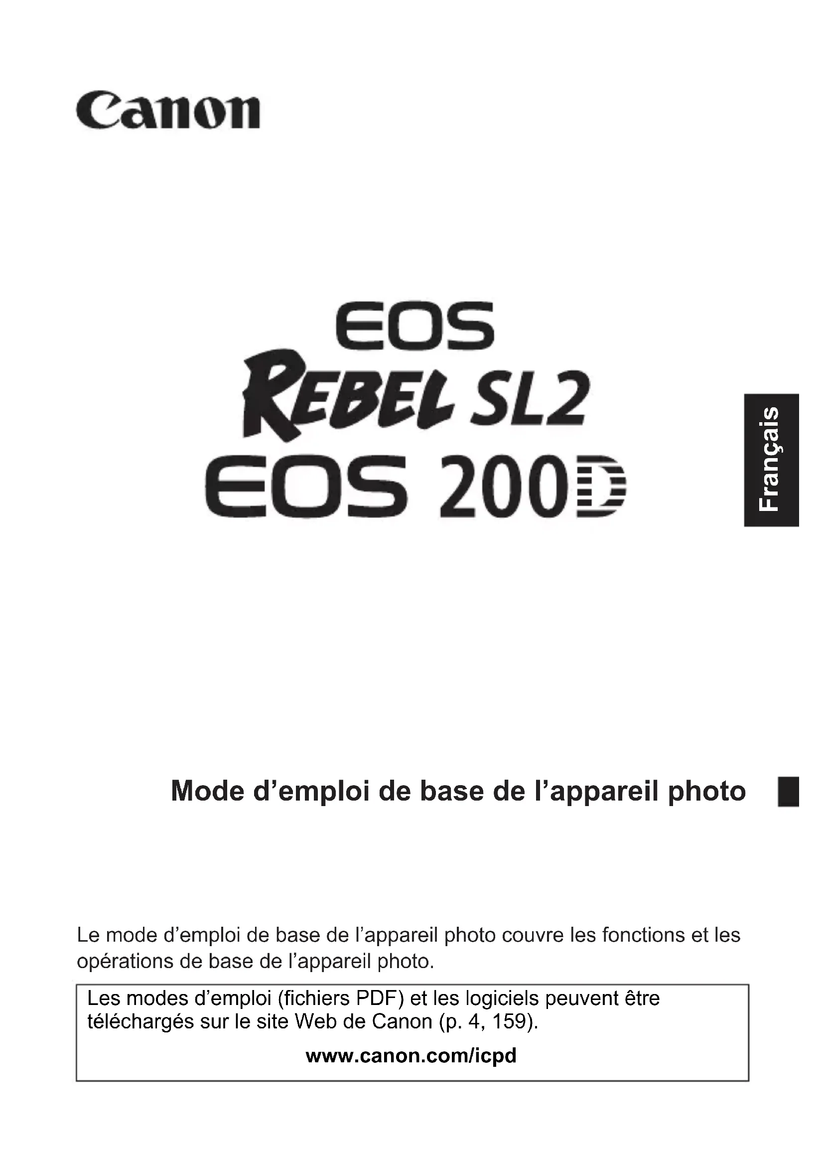 Wi-Fi button............................... W-24 Wi-Fi settings .............................. W-6The descriptions in this Instruction Manual are current as of March 2017. For information on the compatibility with any products introduced after this date, contact any Canon Service Center. For the latest version Instruction Manual, refer to the Canon Web site.Le mode d’emploi de base de l’appareil photo couvre les fonctions et les opérations de base de l’appareil photo. Mode d’emploi de base de l’appareil photo Français www.canon.com/icpd Les modes d’emploi (fichiers PDF) et les logiciels peuvent être téléchargés sur le site Web de Canon (p. 4, 159).2 L’EOS REBEL SL2 ou EOS 200D est un appareil photo numérique reflex à objectif interchangeable équipé d’un capteur CMOS aux détails fins d’environ 24,2 mégapixels effectifs, du processeur DIGIC 7 et d’un système autofocus de grande précision et à grande vitesse doté de 9 collimateurs. Il offre une vitesse maximum de prise de vue en continu d’environ 5,0 photos par seconde, une prise de vue avec Visée par l’écran, un enregistrement vidéo Full-HD (Full High-Definition) et la fonction Wi-Fi/NFC/Bluetooth (communication sans fil). Avant de commencer à prendre des photos, lisez impérativement ce qui suit Afin d’éviter les photos bâclées ou les accidents, lisez en premier les « Consignes de sécurité » (p. 15-17) et les « Précautions d’utilisation » (p. 18-20). Vous devez aussi lire soigneusement le présent document pour vous assurer d’utiliser correctement l’appareil photo. Consultez ce mode d’emploi tout en utilisant votre appareil photo pour vous familiariser avec ce dernier Tout en lisant ce mode d’emploi, procédez à des essais de prise de vue pour voir le résultat. Ceci vous aidera à mieux connaître votre appareil photo. De plus, conservez ce document dans un endroit sûr pour pouvoir vous y référer au besoin. Essais de prise de vue avant utilisation et responsabilité Une fois les photos prises, affichez les images pour vérifier qu’elles ont bien été enregistrées. Canon ne peut être tenu responsable pour toute perte ou tout désagrément occasionné en cas de défectuosité de l’appareil ou de la carte mémoire faisant que les photos ne s’enregistrent pas ou que leur téléchargement est impossible sur un ordinateur. Droits d’auteur La loi régissant les droits d’auteur dans votre pays peut interdire l’utilisation des images enregistrées ou bien de la musique et des images avec de la musique protégées par des droits d’auteur sur la carte mémoire dans un autre cadre que dans le cadre privé. Notez également que la prise de vue lors de représentations ou d’expositions publiques peut être interdite, même à des fins strictement personnelles. Introduction3 Avant de commencer, vérifiez qu’il ne manque aucun des accessoires suivants fournis avec votre appareil photo. Si un accessoire venait à manquer, contactez votre revendeur.