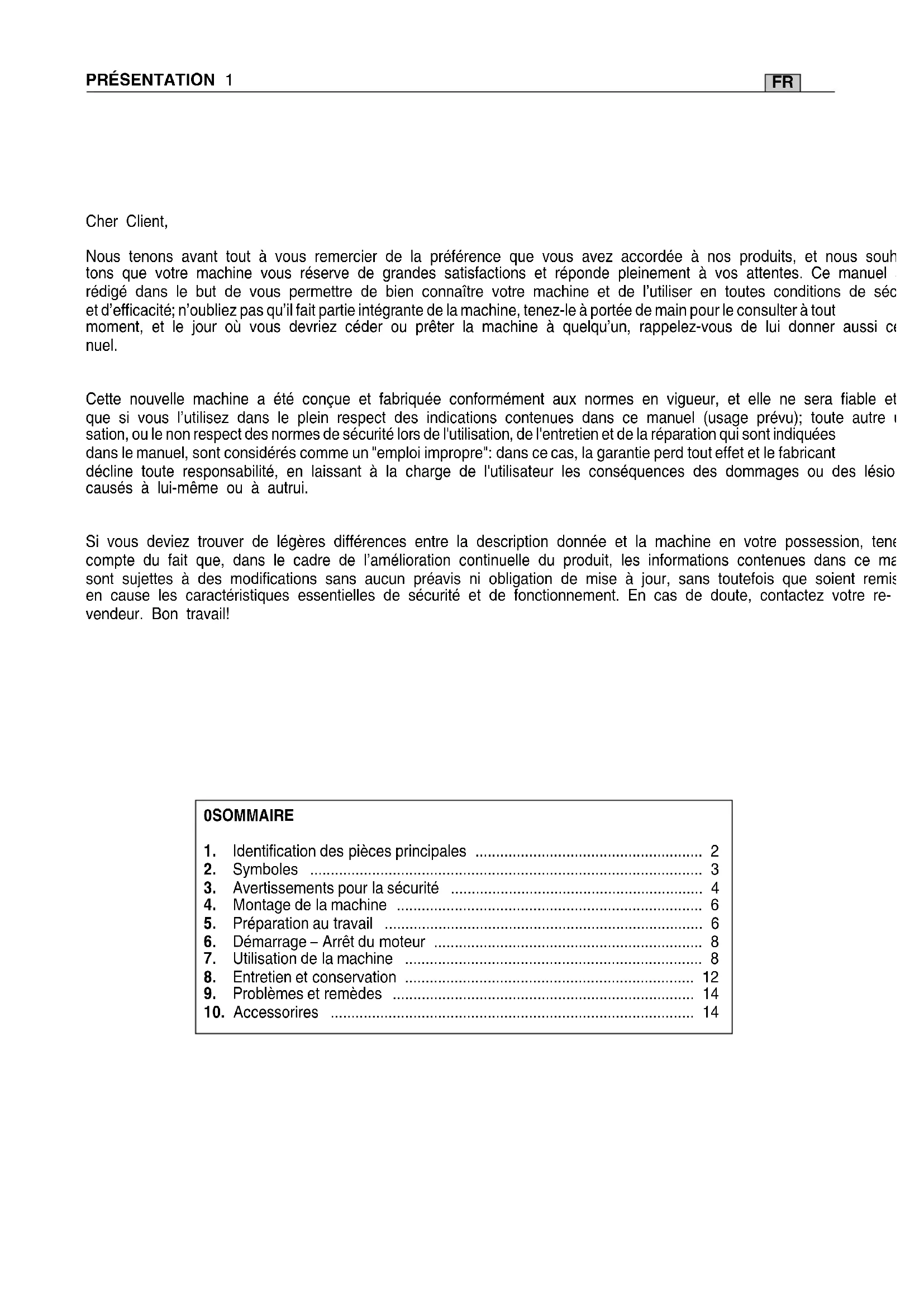 PRÉSENTATION 1 Cher Client, Nous tenons avant tout à vous remercier de la préférence que vous avez accordée à nos produits, et nous souhai- tons que votre machine vous réserve de grandes satisfactions et réponde pleinement à vos attentes. Ce manuel a été rédigé dans le but de vous permettre de bien connaître votre machine et de l’utiliser en toutes conditions de sécurité et d’efficacité; n’oubliez pas qu’il fait partie intégrante de la machine, tenez-le à portée de main pour le consulter à tout moment, et le jour où vous devriez céder ou prêter la machine à quelqu’un, rappelez-vous de lui donner aussi ce ma- nuel. Cette nouvelle machine a été conçue et fabriquée conformément aux normes en vigueur, et elle ne sera fiable et sûre que si vous l’utilisez dans le plein respect des indications contenues dans ce manuel (usage prévu); toute autre utili- sation, ou le non respect des normes de sécurité lors de l'utilisation, de l'entretien et de la réparation qui sont indiquées dans le manuel, sont considérés comme un "emploi impropre": dans ce cas, la garantie perd tout effet et le fabricant décline toute responsabilité, en laissant à la charge de l'utilisateur les conséquences des dommages ou des lésions causés à lui-même ou à autrui. Si vous deviez trouver de légères différences entre la description donnée et la machine en votre possession, tenez compte du fait que, dans le cadre de l’amélioration continuelle du produit, les informations contenues dans ce manuel sont sujettes à des modifications sans aucun préavis ni obligation de mise à jour, sans toutefois que soient remises en cause les caractéristiques essentielles de sécurité et de fonctionnement. En cas de doute, contactez votre re- vendeur. Bon travail! 0SOMMAIRE