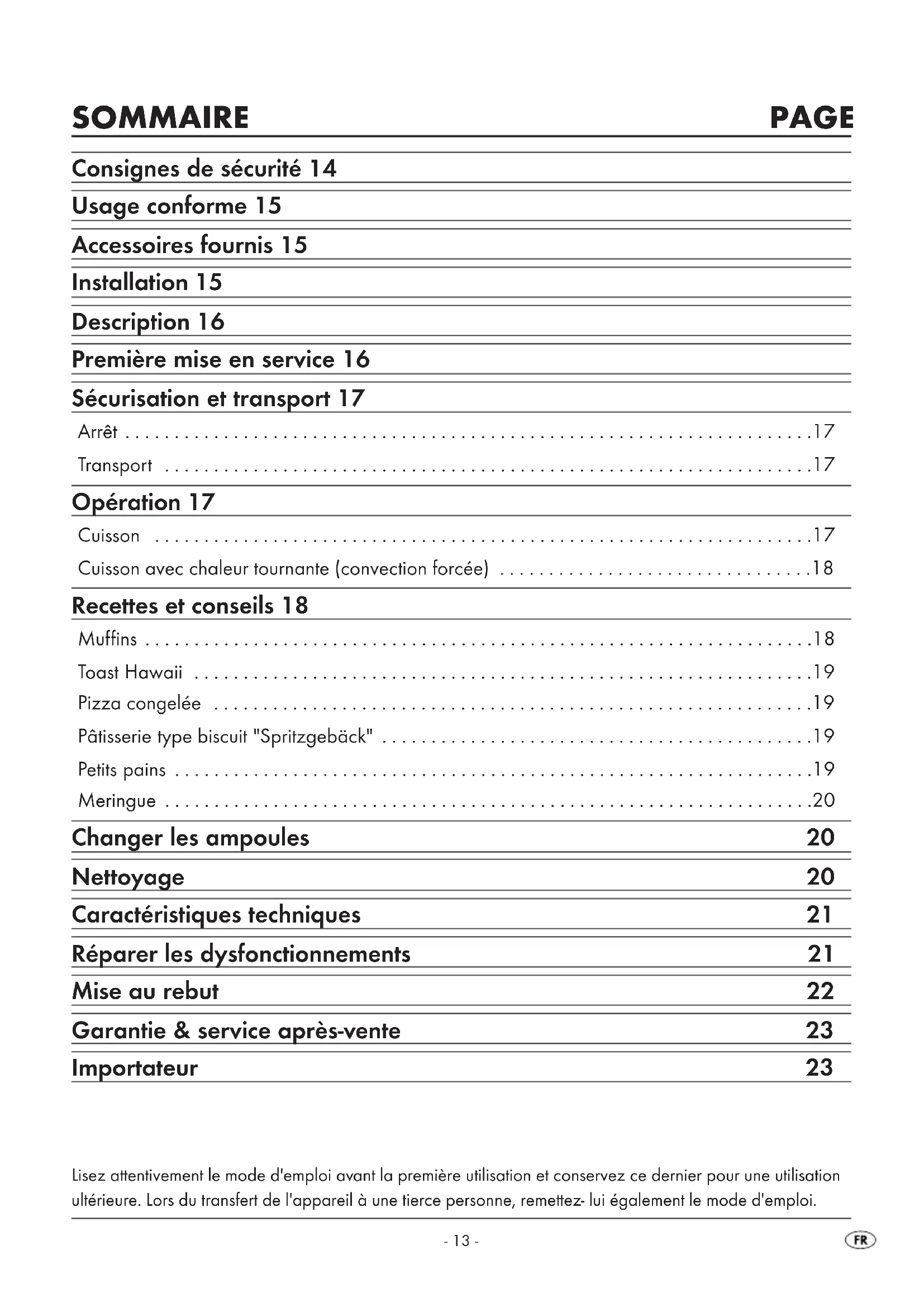- 45 g de sucre Préparation : ³ Mettre le blanc d'oeuf frais dans un récipient type saladier, sans gras. Ne pas mélanger de jaune d'oeuf, sinon le blanc d'oeuf ne montera pas en neige. ³ Battre le blanc d'oeuf doucement, pour éviter la formation de grosses bulles dans la neige. ³ Assaisonner avec une pincée de sel. ³ Ajouter à petites doses la moitié du sucre lorsque la neige commence à prendre de la consistance. ³ Puis fouetter plus énergiquement. ³ Ajouter le reste du sucre. La masse de merin- gue prend une consistance ferme. ³ Remplir de meringue une boîte à douille avec un grand bec verseur et verser sur le plateau recouvert de papier sulfurisé en formant des rosettes, des langues ou tout autre motif. ³ Chauffer le mini-four à environ 100° C avec la fonction "chaleur tournante". ³ Faire cuire environ 2 heures les meringues dans la position du milieu dans le four à environ 100° C, en mode "chaleur tournante". Recettes sans garantie. Toutes les indications relatives aux ingrédients et aux préparations sont des valeurs d'orientation. Complétez ces propositions de recette avec vos expériences personnelles. Nous vous sou- haitons dans tous les cas de réussir et un bon appétit. Changer les ampoules Danger ! Attendez jusqu'à ce que l'appareil se soit refroidi, avant de remplacer les ampoules. Sinon, il y a un risque de brûlures ! Remplacez l'ampoule uniquement par une ampoule du même type (voir le chapitre "Caractéristiques techniques"). ³ Ouvrez la porte en verre