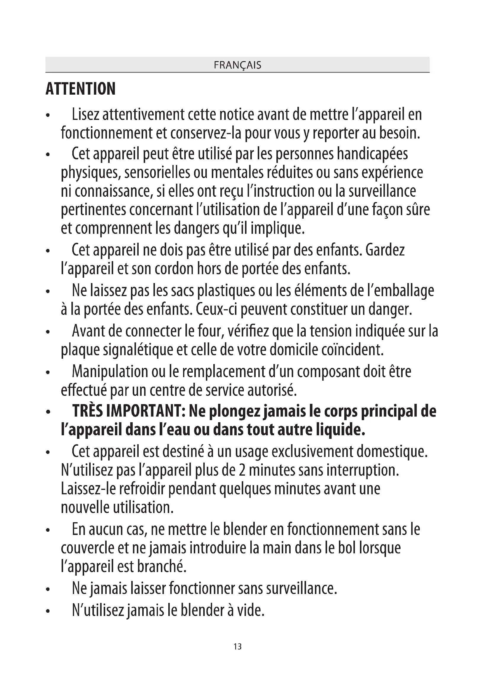 - En aucun cas, ne mettre le blender en fonctionnement sans le couvercle et ne jamais introduire la main dans le bol lorsque l’appareil est branché.