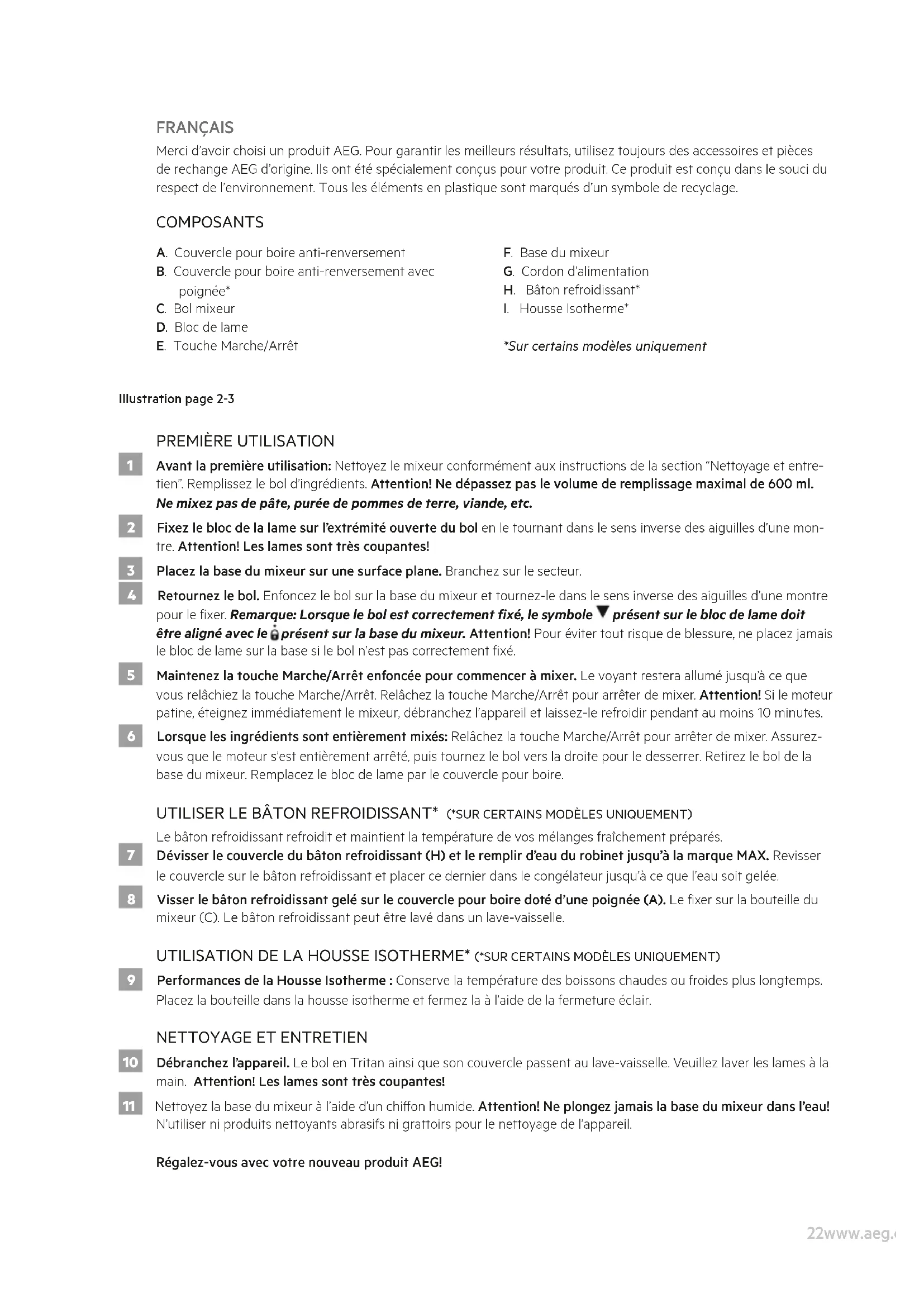 10 Débranchez l’appareil. Le bol en Tritan ainsi que son couvercle passent au lave-vaisselle. Veuillez laver les lames à la main. Attention! Les lames sont très coupantes! 11 Nettoyez la base du mixeur à l’aide d’un chion humide. Attention! Ne plongez jamais la base du mixeur dans l’eau! N’utiliser ni produits nettoyants abrasifs ni grattoirs pour le nettoyage de l’appareil. Régalez-vous avec votre nouveau produit AEG!23www.aeg.com