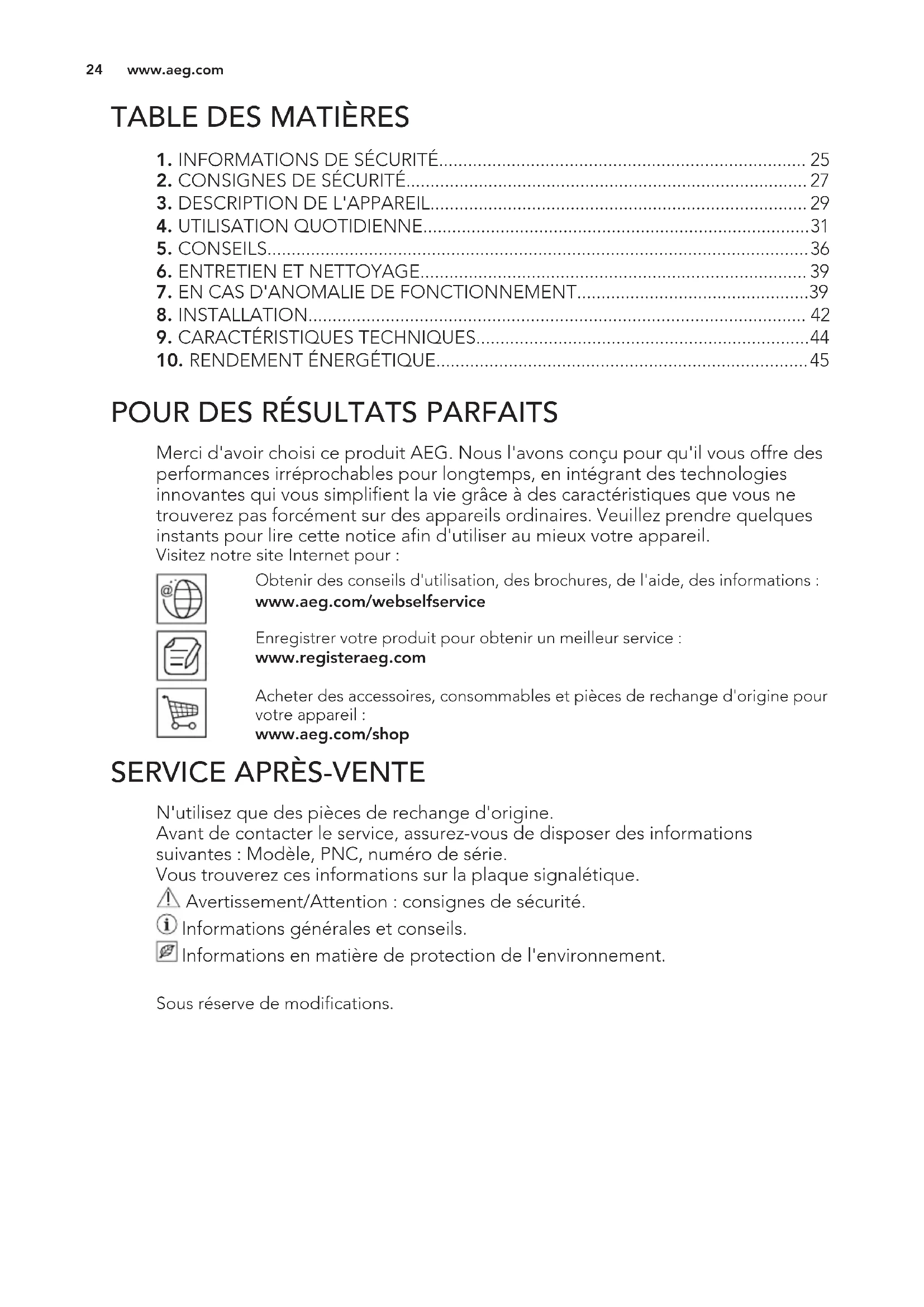 Merci d'avoir choisi ce produit AEG. Nous l'avons conçu pour qu'il vous offre des performances irréprochables pour longtemps, en intégrant des technologies innovantes qui vous simplifient la vie grâce à des caractéristiques que vous ne trouverez pas forcément sur des appareils ordinaires. Veuillez prendre quelques instants pour lire cette notice afin d'utiliser au mieux votre appareil. Visitez notre site Internet pour : Obtenir des conseils d'utilisation, des brochures, de l'aide, des informations : www.aeg.com/webselfservice Enregistrer votre produit pour obtenir un meilleur service : www.registeraeg.com Acheter des accessoires, consommables et pièces de rechange d'origine pour votre appareil : www.aeg.com/shop