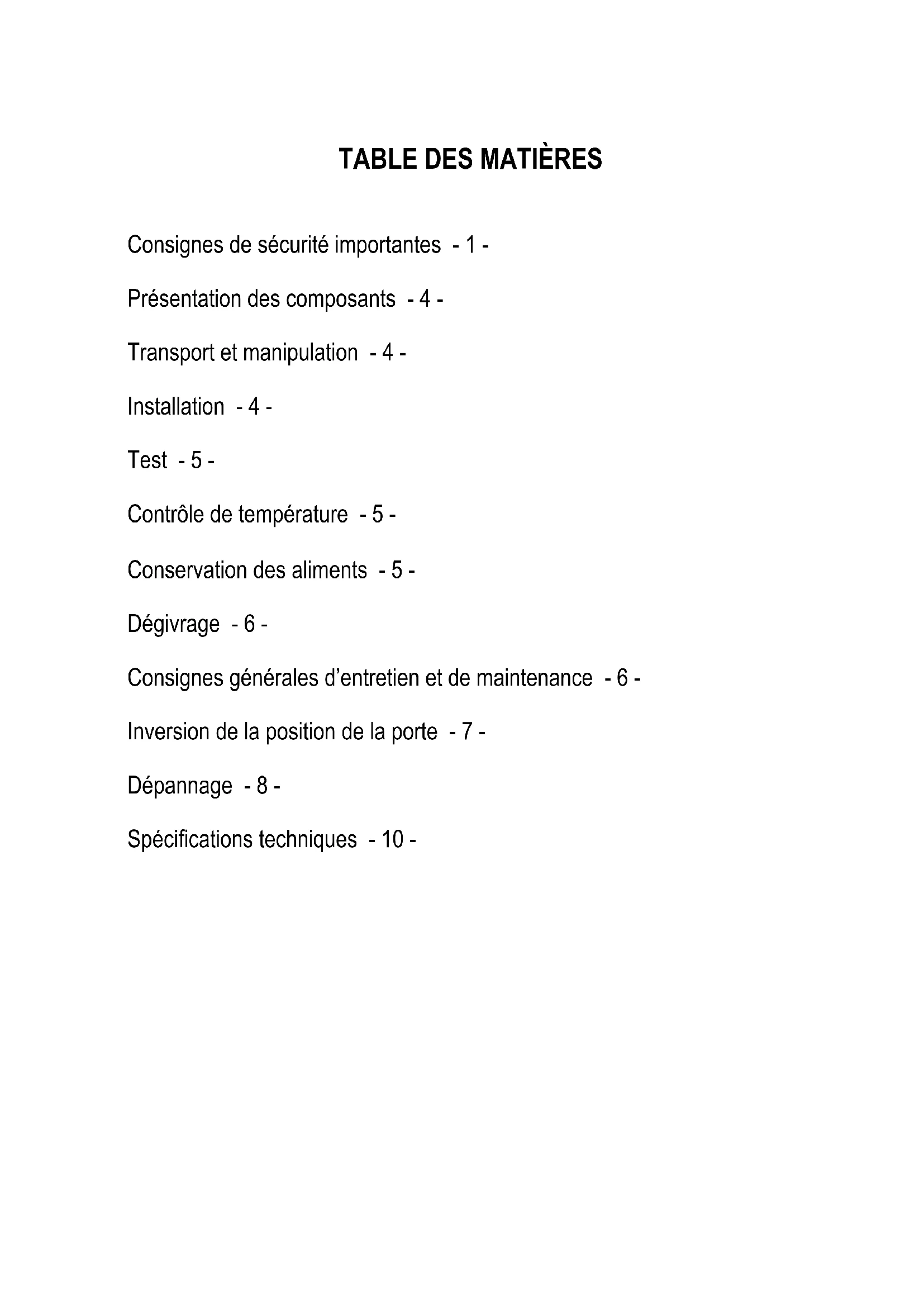 Consignes de sécurité importantes - 1 - Présentation des composants - 4 - Transport et manipulation - 4 - Installation - 4 - Test - 5 - Contrôle de température - 5 - Conservation des aliments - 5 - Dégivrage - 6 - Consignes générales d’entretien et de maintenance - 6 - Inversion de la position de la porte - 7 - Dépannage - 8 - Spécications techniques - 10 -Cet appareil est exclusivement destiné à un usage domestique ! Avant la première utilisation de cet appareil, veuillez lire attentivement ces instructions et conservez le manuel pour une utilisation future.