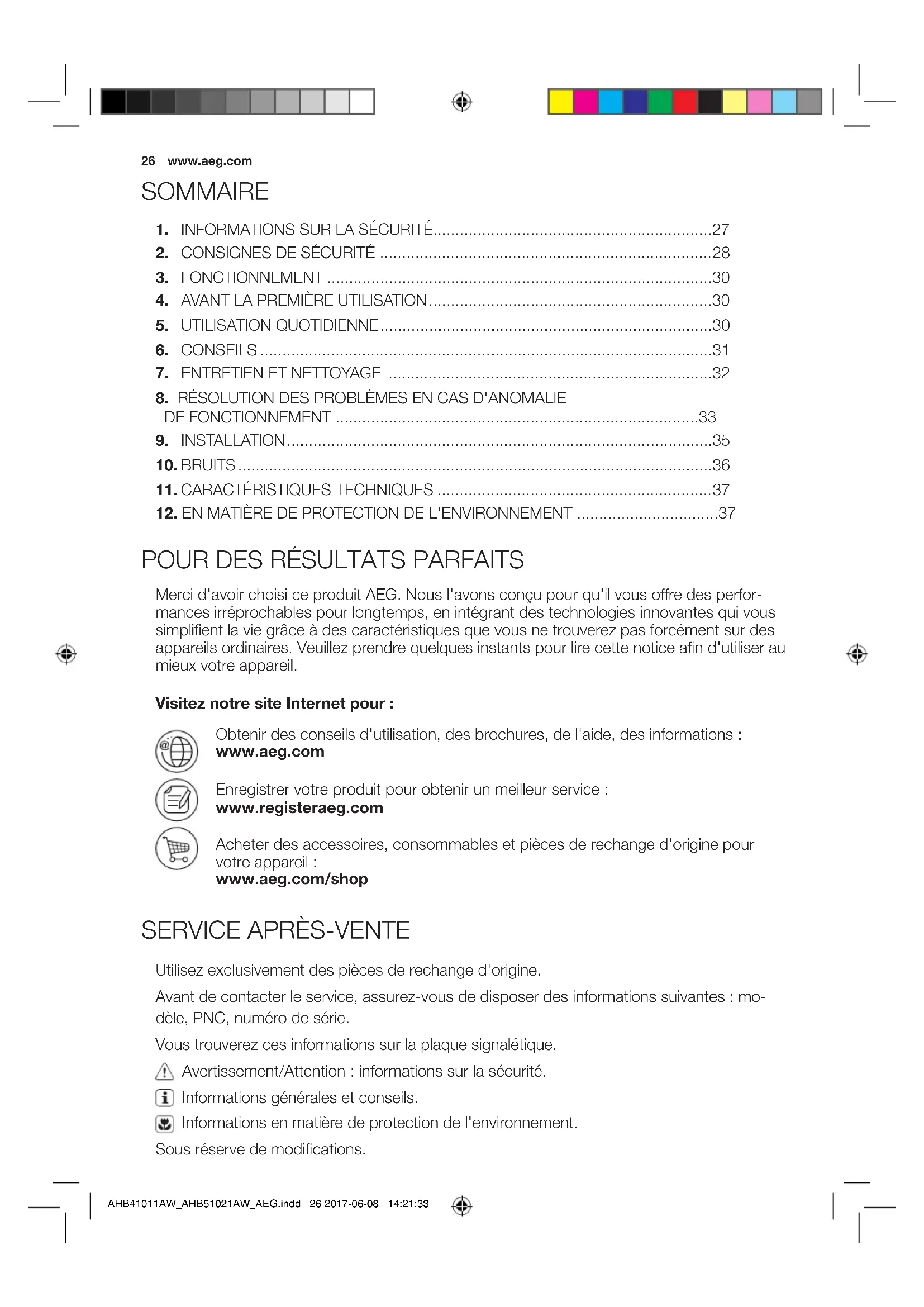 AHB41011AW_AHB51021AW_AEG.indd 26 2017-06-08 14:21:3327 FRANÇAIS Avant d'installer et d'utiliser cet appareil, lisez soigneusement les instructions fournies. Le fabricant ne peut être tenu pour responsable des dommages et blessures liés à une mauvaise installation ou utilisation. Conservez toujours cette notice avec votre appareil pour vous y référer ultérieurement. Sécurité des enfants et des personnes vulnérables
