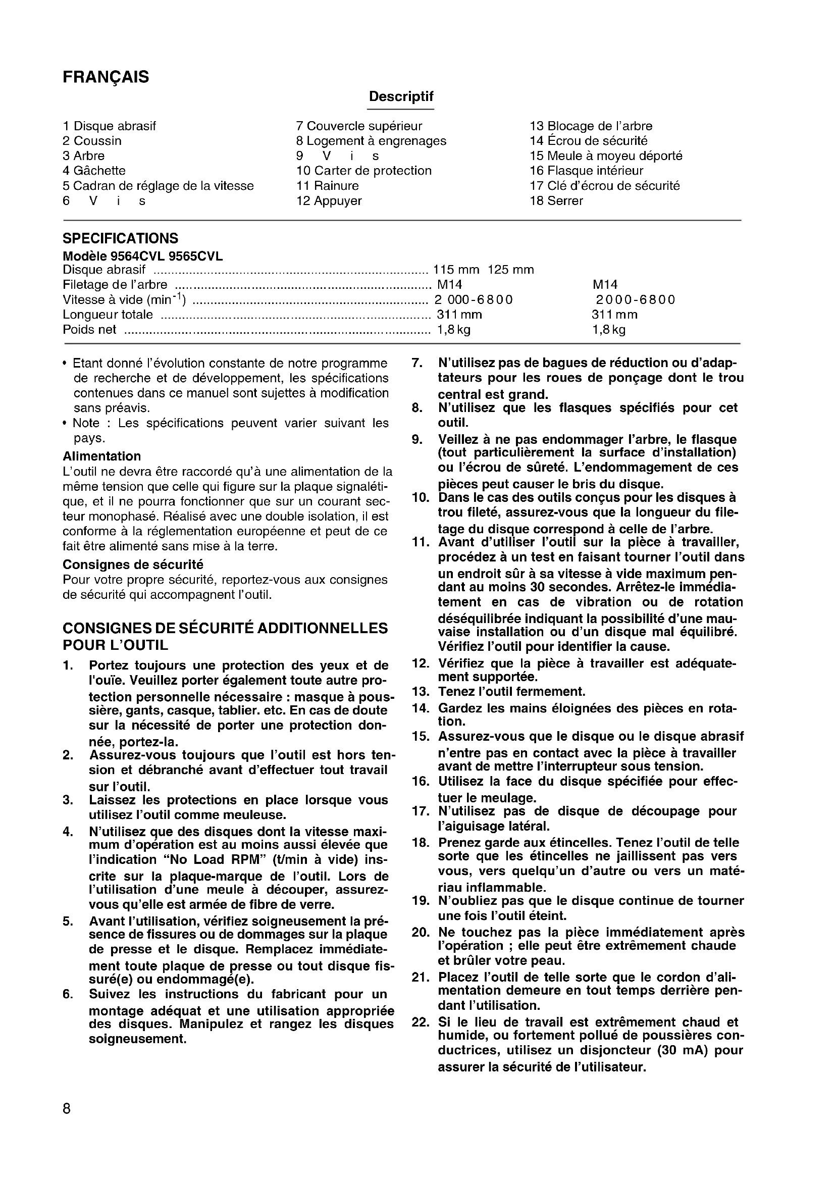 mum d’opération est au moins aussi élevée que l’indication “No Load RPM” (t/min à vide) ins- crite sur la plaque-marque de l’outil. Lors de l’utilisation d’une meule à découper, assurez- vous qu’elle est armée de fibre de verre.