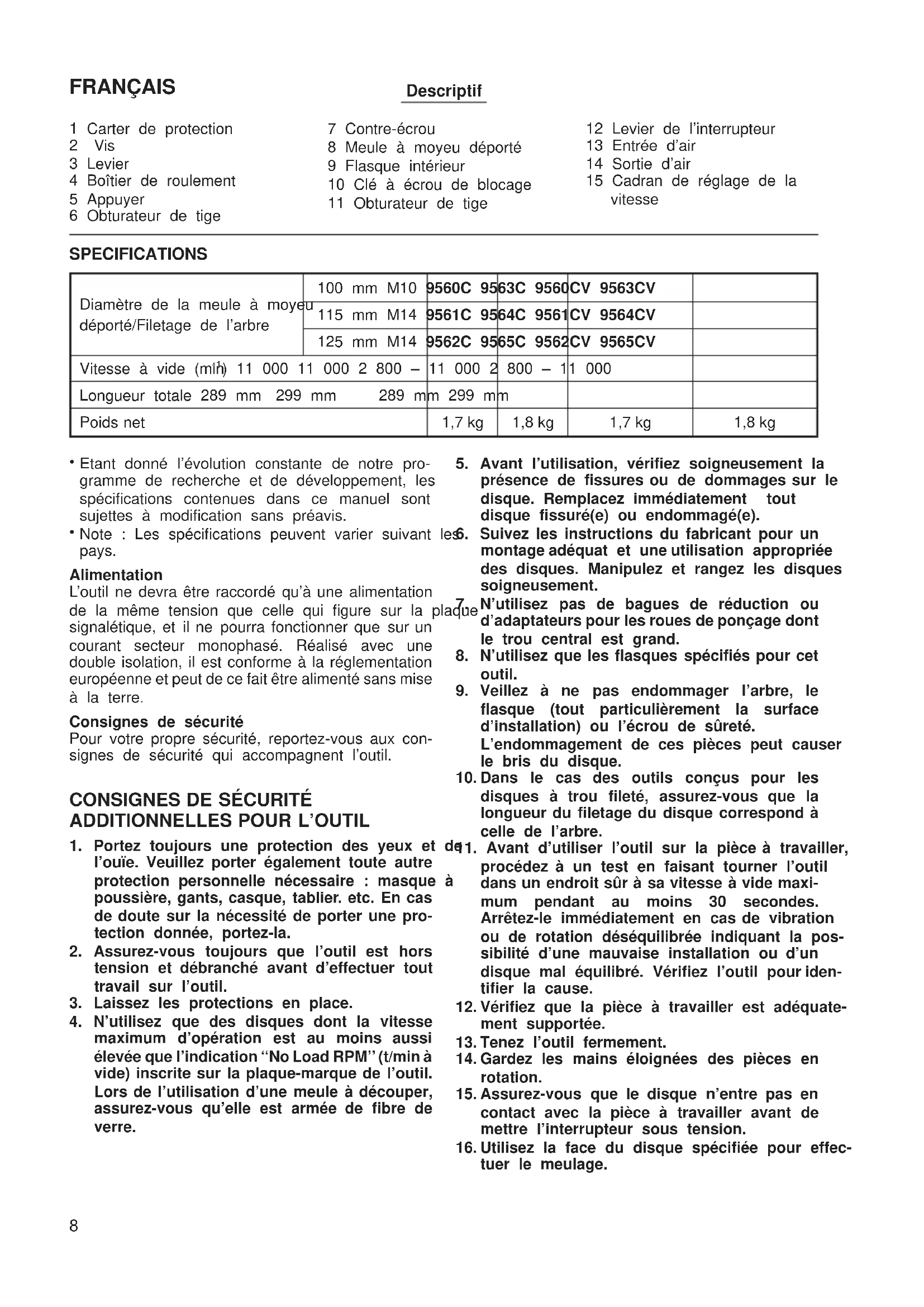 Montage du carter de protection (Fig. 1 et 2) Important : Vérifiez toujours que l’outil est arrêté et qu’il est débranché du secteur avant d’installer ou de retirer le carter de protection. Tirer le levier dans le sens de la flèche après avoir desserré la vis. Installer le carter de protection sur le boîtier de roulement en ajustant la partie convexe du carter de protection à la partie concave du boîtier de roulement. Tourner le carter de protection de 180 degrés. Fixez-le avec la vis après avoir tiré le levier dans le sens indiqué par la flèche. L’angle du carter de protection peut être ajusté en fonction du travail à effectuer, à l’aide du levier. Retrait du carter de protection Pour retirer le carter de protection, suivre la procé- dure d’installation en sens inverse. Montage de la poignée latérale (poignée auxiliaire) (Fig. 3) Important : Vérifiez toujours que l’outil est arrêté et qu’il est débranché du secteur avant d’installer ou de retirer la poignée latérale. Toujours fixer fermement la poignée latérale à l’outil avant de l’utiliser. La poignée latérale peut être ins- tallée d’un côté comme de l’autre de l’outil, du côté le plus pratique et qui permet de garder le carter de protection en position adéquate. En cours d’utilisa- tion, toujours saisir fermement l’outil à deux mains par la poignée d’interrupteur et par la poignée latérale. Bouton de blocage (Fig. 4) Appuyez sur le bouton de blocage pour éviter que l’axe ne tourne lors de l’installation ou du retrait des accessoires. ATTENTION : N’actionnez jamais le bouton de blocage lorsque l’axe est en mouvement. Vous pourriez endommager l’outil. Pose et dépose de la meule à centre concave (Fig. 5 et 6) Important : Assurez-vous toujours que le contact est coupé et l’outil débranché avant de poser ou de retirer la meule. Montez la flasque intérieure sur l’axe. Installez la meule sur la flasque intérieure et vissez l’écrou de blocage sur l’axe. Pour serrer l’écrou, appuyez fermement sur le bouton de blocage de façon que l’arbre ne puisse pas tourner, puis, à l’aide de la clé à ergots, serrez à fond en tournant vers la droite. Pour retirer la meule, procédez en ordre inverse. Interrupteur (Fig. 7) ATTENTION : Avant de brancher l’outil, toujours vérifier que l’inter- rupteur fonctionne bien et retourne à la position ‘‘OFF’’ lorsque le côté du levier de l’interrupteur est relâché. Pour faire démarrer l’outil, faire glisser le levier de l’interrupteur sur la position ‘‘I’’. Pour un fonctionnement continu, relâcher l’avant du levier de l’interrupteur et faire glisser sur ‘‘I’’ tel qu’indiqué plus haut. L’interrupteur se verrouille sur cette position pour un fonctionnement continu. Pour arrêter l’outil lorsqu’il est en position verrouillée, faites glisser le levier de l’interrupteur sur la position ‘‘O’’ en appuyant sur sa partie arrière. 9Cadran de réglage de la vitesse (pour les modèles 9560CV, 9561CV, 9562CV, 9564CV et 9565CV) (Fig. 8) La vitesse de rotation peut être modifiée en tournant le cadran de réglage de la vitesse sur un numéro de réglage donné, de1à5. Une vitesse plus élevée est obtenue lorsque le cadran est tourné dans le sens du numéro 5. Une vitesse plus basse est obtenue lorsqu’il est tourné dans le sens du numéro 1. Reportez-vous au tableau qui suit pour le rapport entre les réglages numérotés sur le cadran et la vitesse approximative de rotation. Numéro min