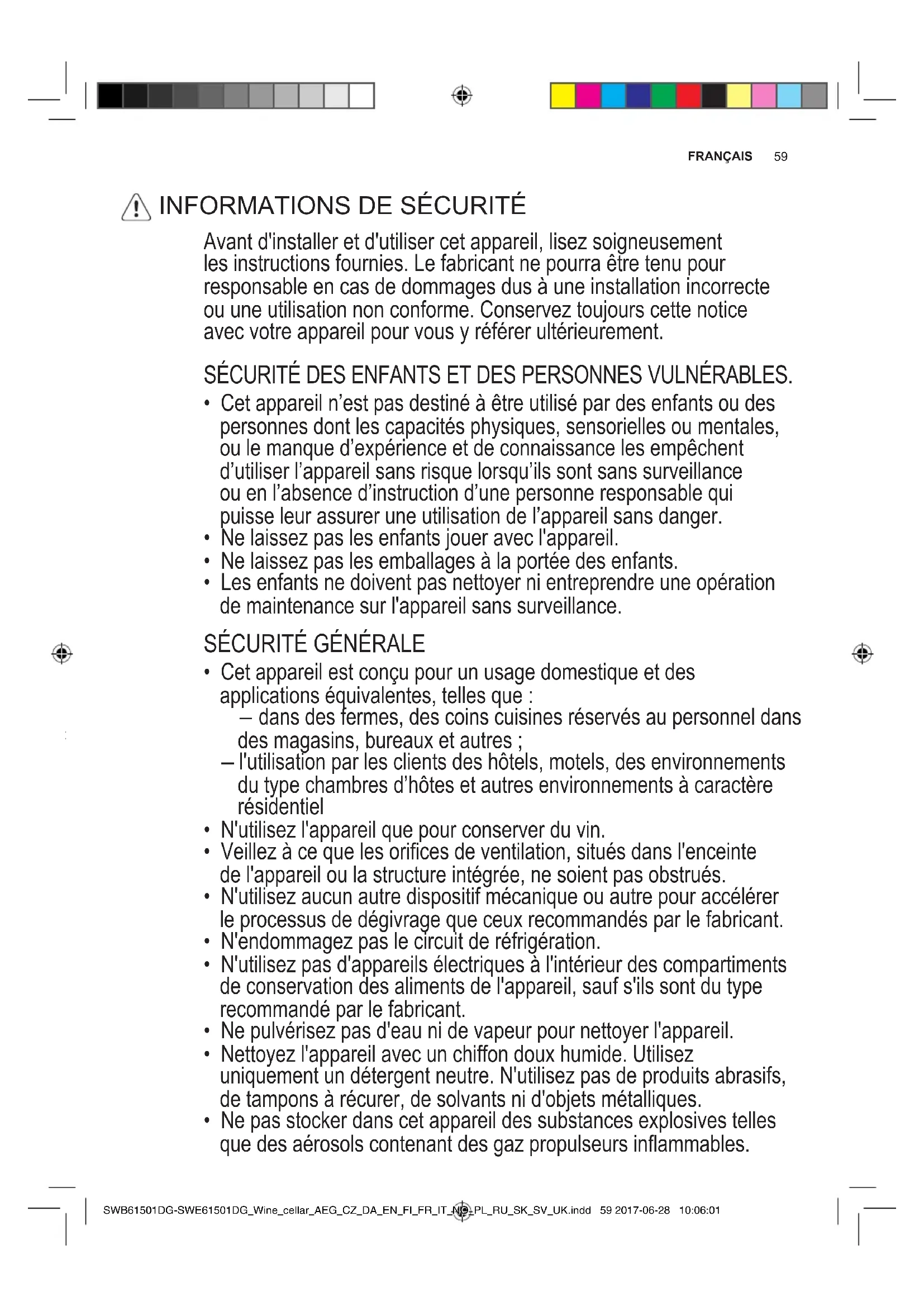 TABLEDESMATIÈRES POURDEPARFAITSRESULTATS SWB61501DG-SWE61501DG_Wine_cellar_AEG_CZ_DA_EN_FI_FR_IT_NO_PL_RU_SK_SV_UK.indd 58 2017-06-28 10:06:0159 FRANÇAIS Utiliseztoujoursdespiècesd'origine. Avantdecontacterleserviceaprès-vente,assurez-vousdedisposer desinformationssuivantes:Modèle,PNC,numérodesérie. Voustrouverezcesinformationssurlaplaquesignalétique. Avertissement/Attention:consignesdesécurité. Informationsgénéralesetconseils. Informationsenmatièredeprotectiondel'environnement. Sujetàmodicationsansnoticepréalable. Mercid'avoirchoisiceproduitAEG.Nousl'avonsconçupourqu'ilvousoffre desperformancesirréprochablespourlongtemps,enintégrantdestechnologies innovantesquivoussimplientlaviegrâceàdescaractéristiquesquevousne trouverezpasforcémentsurdesappareilsordinaires.Veuillezprendrequelques instantspourlirecettenoticeand'utiliseraumieuxvotreappareil. Visitez notre site Internet pour : Obtenirdesconseilsd'utilisation,desbrochures,del'aide,desinformations: www.aeg.com/webselfservice Enregistrervotreproduitpourobtenirunmeilleurservice: www.registeraeg.com Acheterdesaccessoires,consommablesetpiècesderechanged'origine pourvotreappareil: www.aeg.com/shop Avant d'installer et d'utiliser cet appareil, lisez soigneusement les instructions fournies. Le fabricant ne pourra être tenu pour responsable en cas de dommages dus à une installation incorrecte ou une utilisation non conforme. Conservez toujours cette notice avec votre appareil pour vous y référer ultérieurement. SÉCURITÉ DES ENFANTS ET DES PERSONNES VULNÉRABLES.
