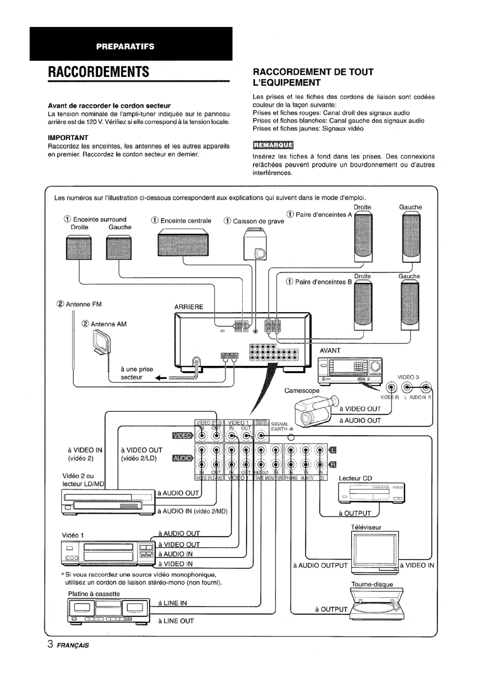 _._Qcm (0Antenne FMMode d’ernploi, etc.Antenne AMFRAN~AIS ~RACCORDEMENTS Avant de raccorder Ie cordon secteur La tension nominalede I’ampli-tuner indiquee surlepanneau arriere est de 120 V. Verifiez si elle correspond a la tension locale. IMPORTANT Raccordez Ies enceintes, Ies antennes et Ies autres appareils en premier. Raccordez Ie cordon secteur en dernier.