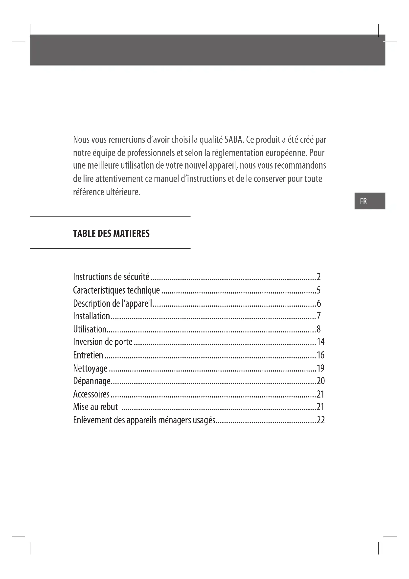 - Enlèvement des appareils ménagers usagés Nous vous remercions d’avoir choisi la qualité SABA. Ce produit a été créé par notre équipe de professionnels et selon la réglementation européenne. Pour une meilleure utilisation de votre nouvel appareil, nous vous recommandons de lire attentivement ce manuel d’instructions et de le conserver pour toute référence ultérieure. FRInstructions de sécurité p. 22