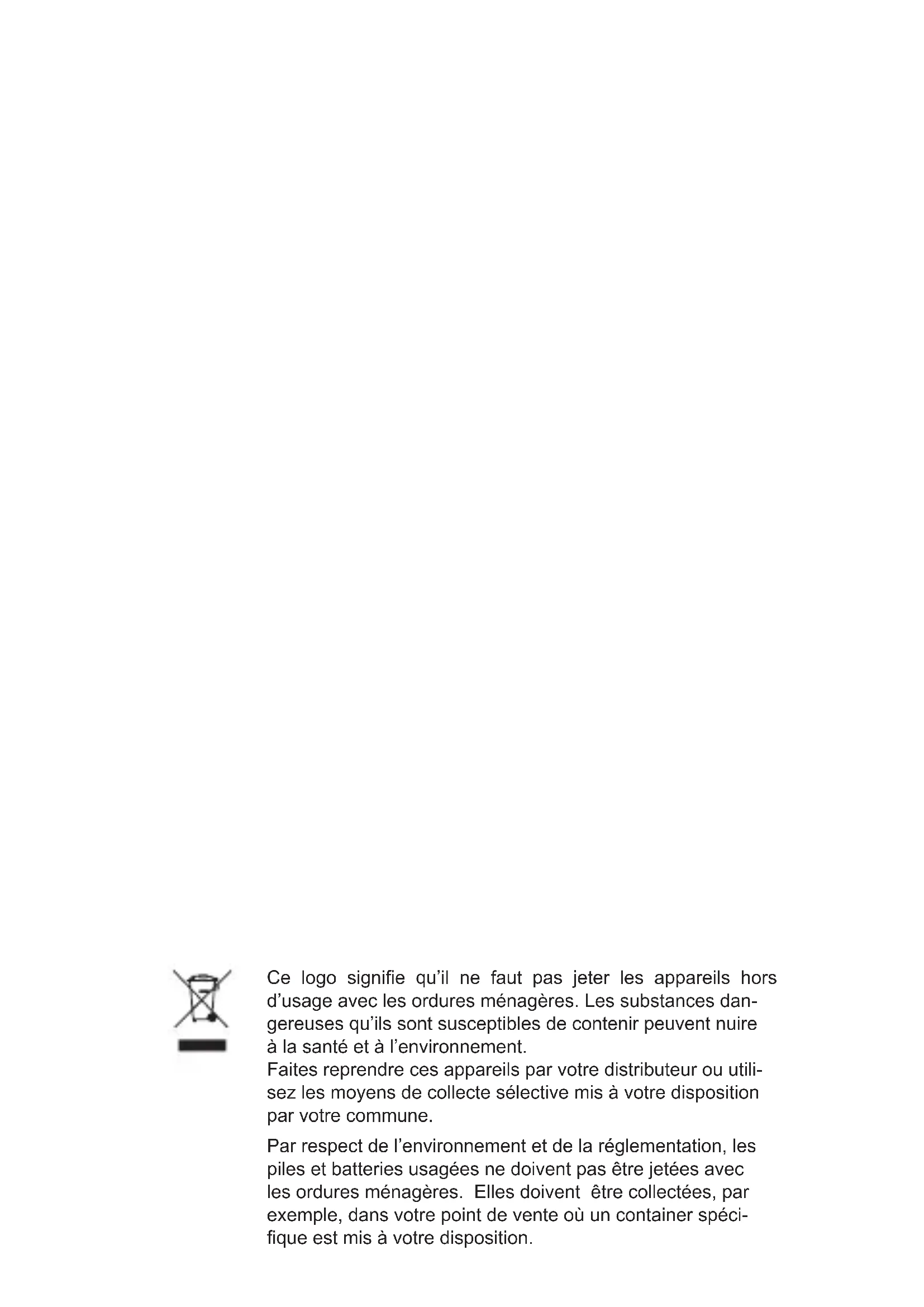 Ce logo signie qu’il ne faut pas jeter les appareils hors d’usage avec les ordures ménagères. Les substances dan- gereuses qu’ils sont susceptibles de contenir peuvent nuire à la santé et à l’environnement. Faites reprendre ces appareils par votre distributeur ou utili- sez les moyens de collecte sélective mis à votre disposition par votre commune. Par respect de l’environnement et de la réglementation, les piles et batteries usagées ne doivent pas être jetées avec les ordures ménagères. Elles doivent être collectées, par exemple, dans votre point de vente où un container spéci- que est mis à votre disposition.