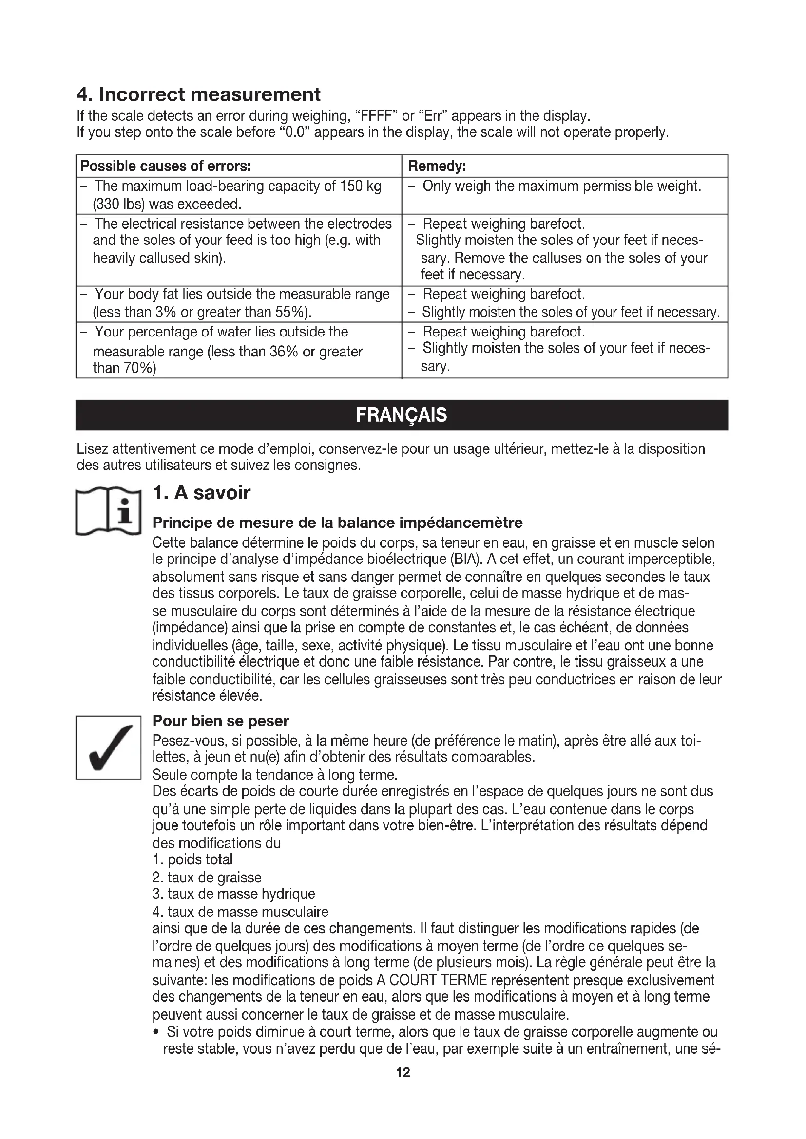 - Si votre poids diminue à court terme, alors que le taux de graisse corporelle augmente ou reste stable, vous n’avez perdu que de l’eau, par exemple suite à un entraînement, une sé- Possible causes of errors: – The maximum load-bearing capacity of 150 kg (330 lbs) was exceeded. – The electrical resistance between the electrodes and the soles of your feed is too high (e.g. with heavily callused skin). – Your body fat lies outside the measurable range (less than 3% or greater than 55%). – Your percentage of water lies outside the measurable range (less than 36% or greater than 70%) Remedy: – Only weigh the maximum permissible weight. – Repeat weighing barefoot. Slightly moisten the soles of your feet if neces- sary. Remove the calluses on the soles of your feet if necessary. – Repeat weighing barefoot. – Slightly moisten the soles of your feet if necessary. – Repeat weighing barefoot. – Slightly moisten the soles of your feet if neces- sary.13 ance de sauna ou un régime visant uniquement à une perte de poids rapide.