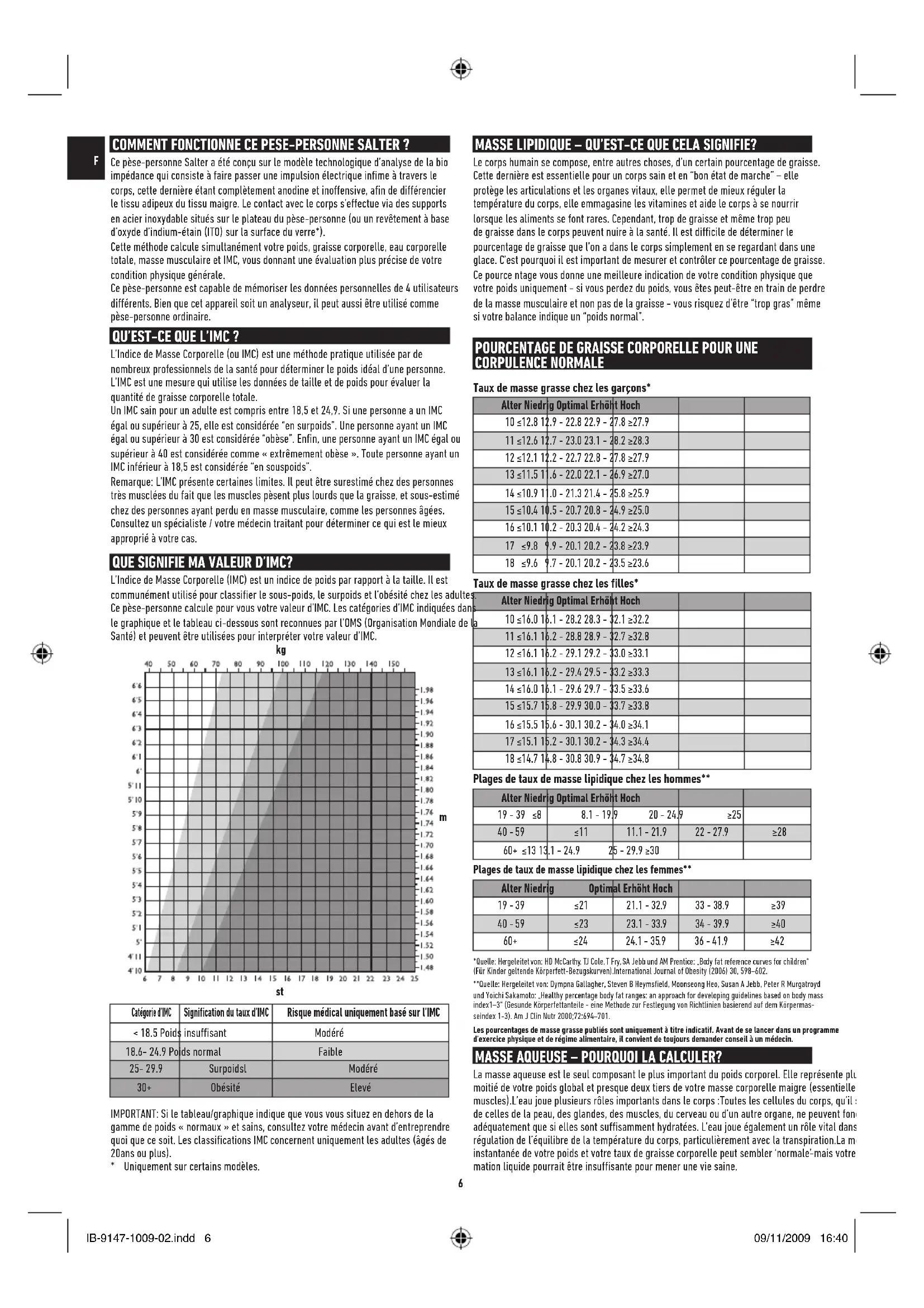 COMMENT FONCTIONNE CE PESE-PERSONNE SALTER ? Ce pèse-personne Salter a été conçu sur le modèle technologique d’analyse de la bio impédance qui consiste à faire passer une impulsion électrique infime à travers le corps, cette dernière étant complètement anodine et inoensive, afin de diérencier le tissu adipeux du tissu maigre. Le contact avec le corps s’eectue via des supports en acier inoxydable situés sur le plateau du pèse-personne (ou un revêtement à base d’oxyde d’indium-étain (ITO) sur la surface du verre*). Cette méthode calcule simultanément votre poids, graisse corporelle, eau corporelle totale, masse musculaire et IMC, vous donnant une évaluation plus précise de votre condition physique générale. Ce pèse-personne est capable de mémoriser les données personnelles de 4 utilisateurs diérents. Bien que cet appareil soit un analyseur, il peut aussi être utilisé comme pèse-personne ordinaire. MASSE LIPIDIQUE – QU’EST-CE QUE CELA SIGNIFIE? Le corps humain se compose, entre autres choses, d’un certain pourcentage de graisse. Cette dernière est essentielle pour un corps sain et en “bon état de marche” – elle protège les articulations et les organes vitaux, elle permet de mieux réguler la température du corps, elle emmagasine les vitamines et aide le corps à se nourrir lorsque les aliments se font rares. Cependant, trop de graisse et même trop peu de graisse dans le corps peuvent nuire à la santé. Il est dicile de déterminer le pourcentage de graisse que l’on a dans le corps simplement en se regardant dans une glace. C’est pourquoi il est important de mesurer et contrôler ce pourcentage de graisse. Ce pource ntage vous donne une meilleure indication de votre condition physique que votre poids uniquement - si vous perdez du poids, vous êtes peut-être en train de perdre de la masse musculaire et non pas de la graisse - vous risquez d’être “trop gras” même si votre balance indique un “poids normal”. MASSE AQUEUSE – POURQUOI LA CALCULER? La masse aqueuse est le seul composant le plus important du poids corporel. Elle représente plus de la moitié de votre poids global et presque deux tiers de votre masse corporelle maigre (essentiellement les muscles).L’eau joue plusieurs rôles importants dans le corps :Toutes les cellules du corps, qu’il s’agisse de celles de la peau, des glandes, des muscles, du cerveau ou d’un autre organe, ne peuvent fonctionner adéquatement que si elles sont suffisamment hydratées. L’eau joue également un rôle vital dans la régulation de l’équilibre de la température du corps, particulièrement avec la transpiration.La mesure instantanée de votre poids et votre taux de graisse corporelle peut sembler ‘normale’ mais votre consom