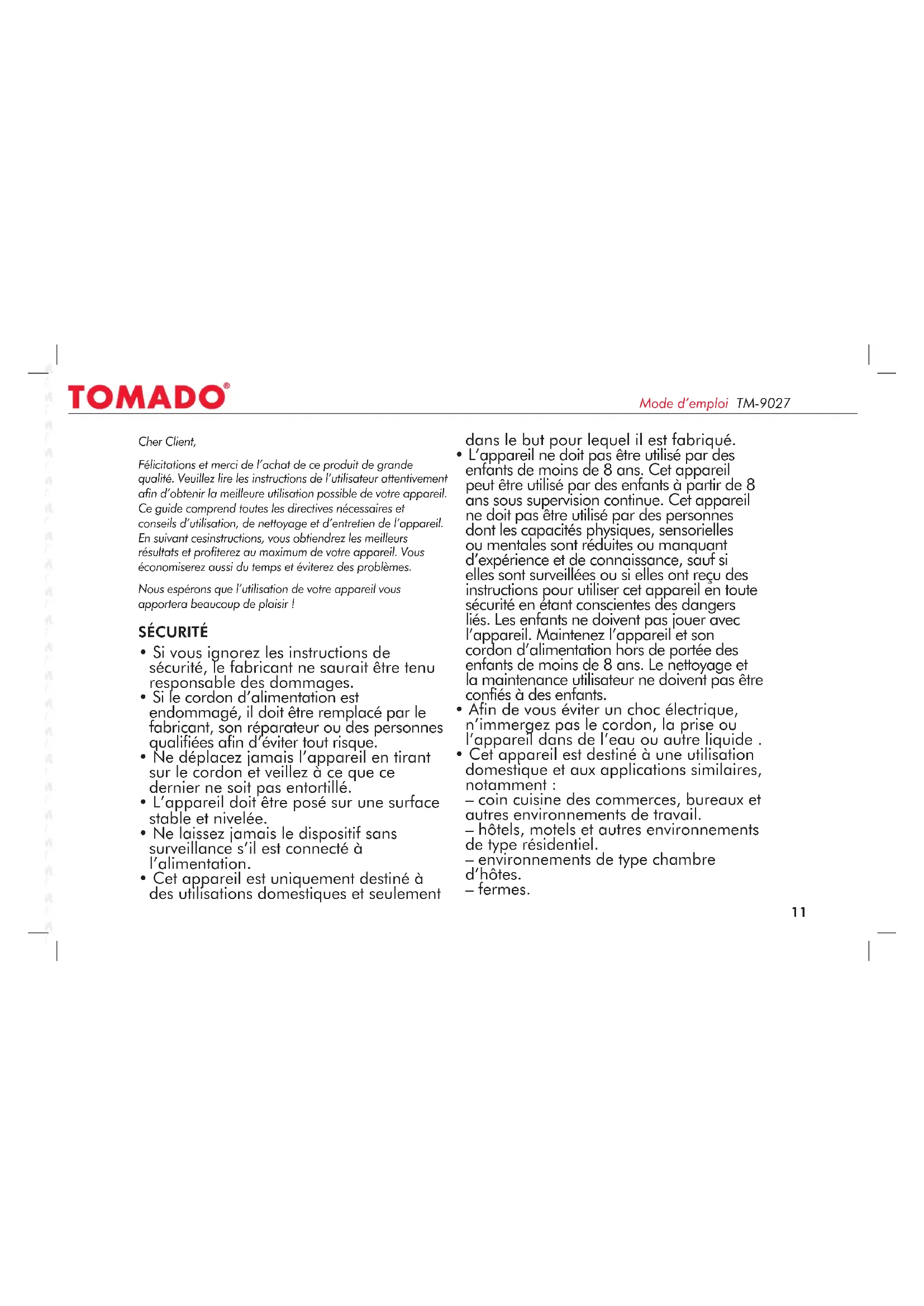 Retrouvez gratuitement la notice de l'appareil TM9027 Tomado au format PDF.