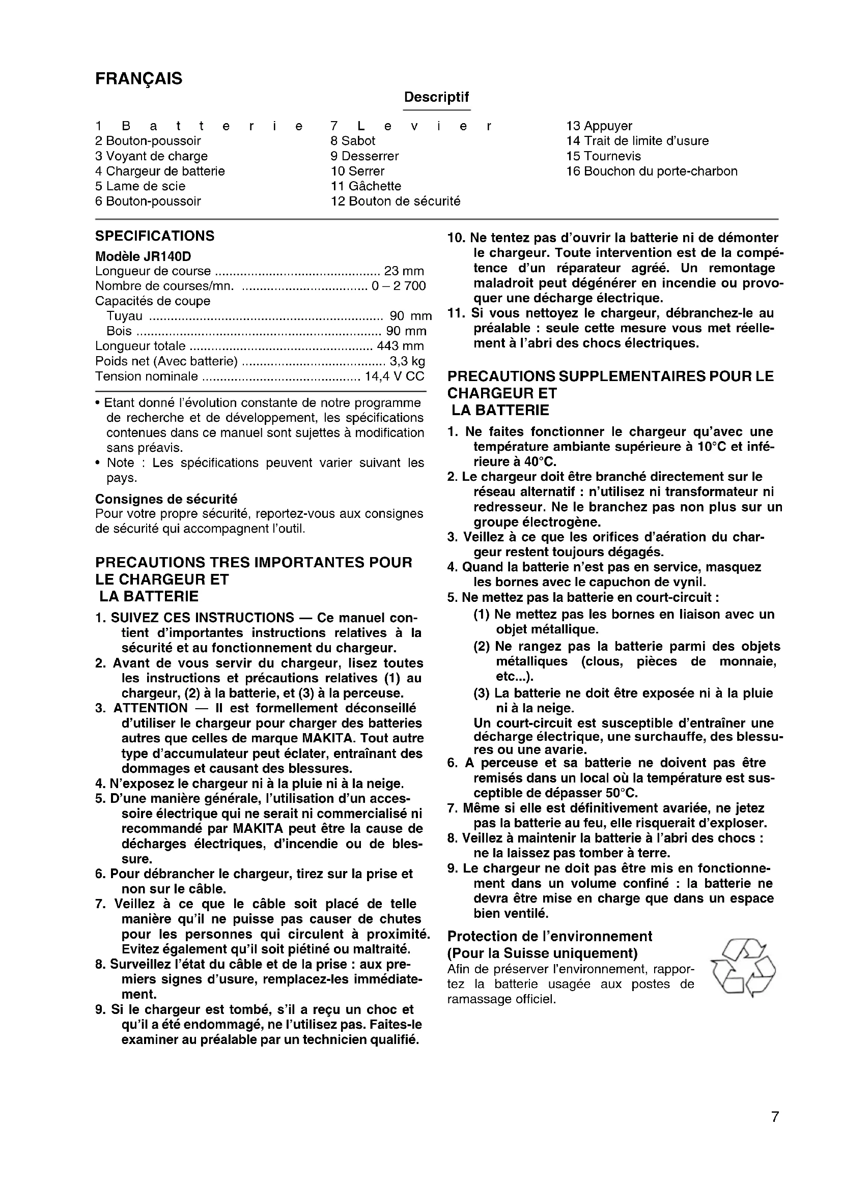 - Appuyez toujours fermement le sabot contre le maté- riau durant le sciage. Si le sabot s’écarte du matériau durant l’opération, de fortes vibrations et une torsion de la lame se produiront pouvant entraîner la rupture, extrêmement dangereuse, de celle-ci. ENTRETIEN ATTENTION : Assurez-vous toujours que l’outil est hors tension et que la batterie a été enlevée avant d’effectuer toute interven- tion sur l’outil. Remplacement des charbons (Fig. 10 et 11) Remplacez les charbons lorsqu’ils sont usés jusqu’à la marque de limite. Les doux doivent être remplacées simultanément. Pour maintenir la sécurité et la fiabilité des produits, les réparations, l’entretien ou les réglages doivent être effec- tués par le Centre d’Entretien Makita.10 DEUTSCH Übersicht 1 Blockakku 2 Schnellverschluß 3 Ladekontrolleuchte 4 Ladegerät 5 Sägeblatt 6 Schnellverschluß 7 Arretierhebel 8 Führungsanschlag 9 Lösen 10 Festziehen 11 Elektronikschalter 12 Einschaltsperrknopf 13 Hineindrücken 14 Verschleißgrenze 15 Schraubendreher 16 Kohlebürstenkappe TECHNISCHE DATEN Modell JR140D Hubhöhe ............................................................... 23 mm Hubzahl ...................................................0 – 2 700 min