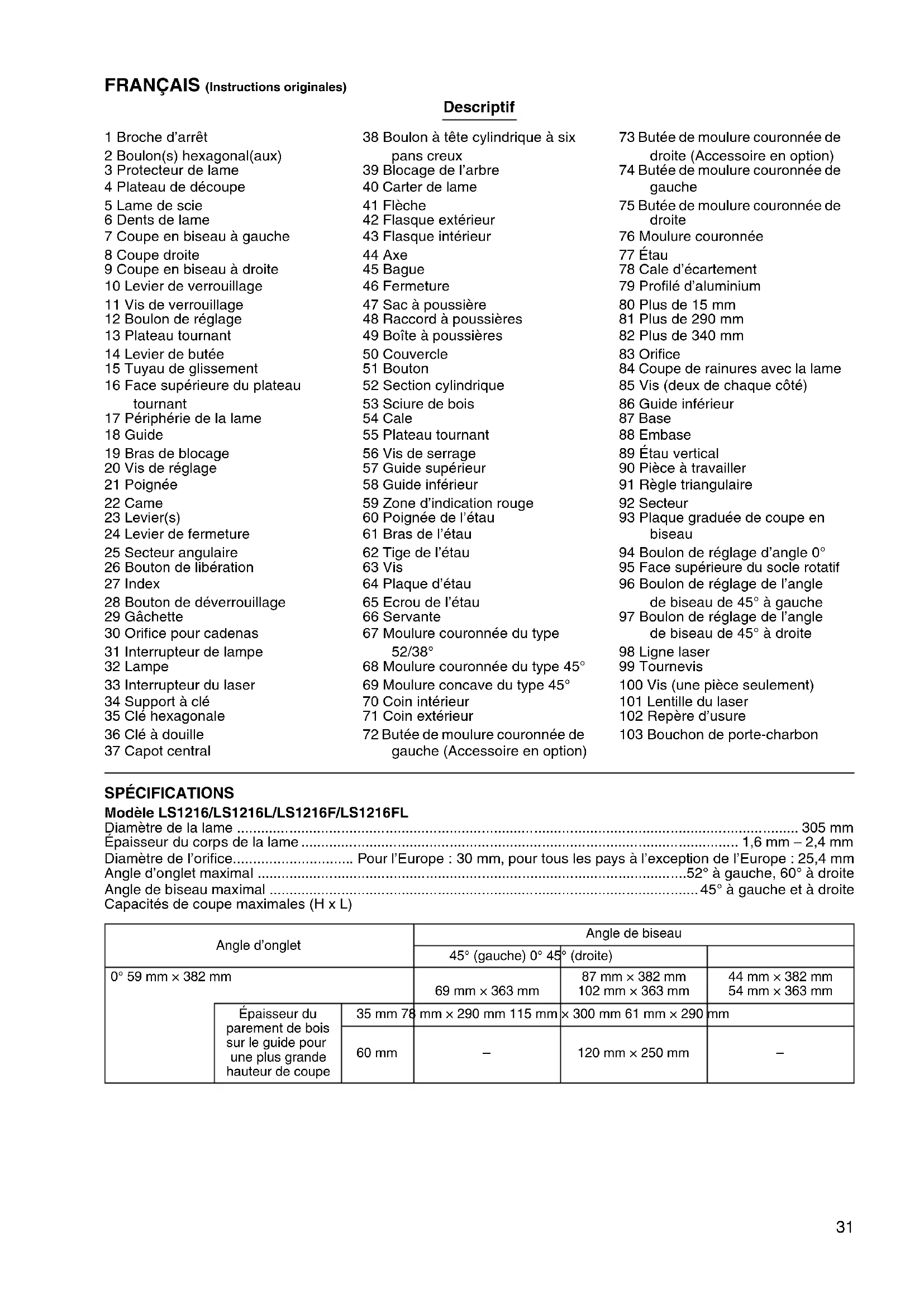 Yasushi Fukaya Director Makita, Jan-Baptist Vinkstraat 2, 3070, Belgium31 FRANÇAIS (Instructions originales) Descriptif 1 Broche d’arrêt 2 Boulon(s) hexagonal(aux) 3 Protecteur de lame 4 Plateau de découpe 5 Lame de scie 6 Dents de lame 7 Coupe en biseau à gauche 8 Coupe droite 9 Coupe en biseau à droite 10 Levier de verrouillage 11 Vis de verrouillage 12 Boulon de réglage 13 Plateau tournant 14 Levier de butée 15 Tuyau de glissement 16 Face supérieure du plateau tournant 17 Périphérie de la lame 18 Guide 19 Bras de blocage 20 Vis de réglage 21 Poignée 22 Came 23 Levier(s) 24 Levier de fermeture 25 Secteur angulaire 26 Bouton de libération 27 Index 28 Bouton de déverrouillage 29 Gâchette 30 Orifice pour cadenas 31 Interrupteur de lampe 32 Lampe 33 Interrupteur du laser 34 Support à clé 35 Clé hexagonale 36 Clé à douille 37 Capot central 38 Boulon à tête cylindrique à six pans creux 39 Blocage de l’arbre 40 Carter de lame 41 Flèche 42 Flasque extérieur 43 Flasque intérieur 44 Axe 45 Bague 46 Fermeture 47 Sac à poussière 48 Raccord à poussières 49 Boîte à poussières 50 Couvercle 51 Bouton 52 Section cylindrique 53 Sciure de bois 54 Cale 55 Plateau tournant 56 Vis de serrage 57 Guide supérieur 58 Guide inférieur 59 Zone d’indication rouge 60 Poignée de l’étau 61 Bras de l’étau 62 Tige de l’étau 63 Vis 64 Plaque d’étau 65 Ecrou de l’étau 66 Servante 67 Moulure couronnée du type 52/38° 68 Moulure couronnée du type 45° 69 Moulure concave du type 45° 70 Coin intérieur 71 Coin extérieur 72 Butée de moulure couronnée de gauche (Accessoire en option) 73 Butée de moulure couronnée de droite (Accessoire en option) 74 Butée de moulure couronnée de gauche 75 Butée de moulure couronnée de droite 76 Moulure couronnée 77 Étau 78 Cale d’écartement 79 Profilé d’aluminium 80 Plus de 15 mm 81 Plus de 290 mm 82 Plus de 340 mm 83 Orifice 84 Coupe de rainures avec la lame 85 Vis (deux de chaque côté) 86 Guide inférieur 87 Base 88 Embase 89 Étau vertical 90 Pièce à travailler 91 Règle triangulaire 92 Secteur 93 Plaque graduée de coupe en biseau 94 Boulon de réglage d’angle 0° 95 Face supérieure du socle rotatif 96 Boulon de réglage de l’angle de biseau de 45° à gauche 97 Boulon de réglage de l’angle de biseau de 45° à droite 98 Ligne laser 99 Tournevis 100 Vis (une pièce seulement) 101 Lentille du laser 102 Repère d’usure 103 Bouchon de porte-charbon SPÉCIFICATIONS Modèle LS1216/LS1216L/LS1216F/LS1216FL Diamètre de la lame ............................................................................................................................................ 305 mm Épaisseur du corps de la lame ............................................................................................................. 1,6 mm – 2,4 mm Diamètre de l’orifice.............................. Pour l’Europe : 30 mm, pour tous les pays à l’exception de l’Europe : 25,4 mm Angle d’onglet maximal ...........................................................................................................52° à gauche, 60° à droite Angle de biseau maximal ...........................................................................................................45° à gauche et à droite Capacités de coupe maximales (H x L) Angle d’onglet Angle de biseau 45° (gauche) 0° 45° (droite) 0° 59 mm × 382 mm 69 mm × 363 mm 87 mm × 382 mm 102 mm × 363 mm 44 mm × 382 mm 54 mm × 363 mm Épaisseur du parement de bois sur le guide pour une plus grande hauteur de coupe 35 mm 78 mm × 290 mm 115 mm × 300 mm 61 mm × 290 mm 60 mm – 120 mm × 250 mm –32 Capacités de coupe maximales en position de coupe spéciale Capacités de coupe à largeur maximale en position de coupe spéciale (avec une embase d’une épaisseur de 38 mm (1-1/2”)) Concernant la méthode de coupe, reportez-vous à la section UTILISATION. Vitesse à vide (min