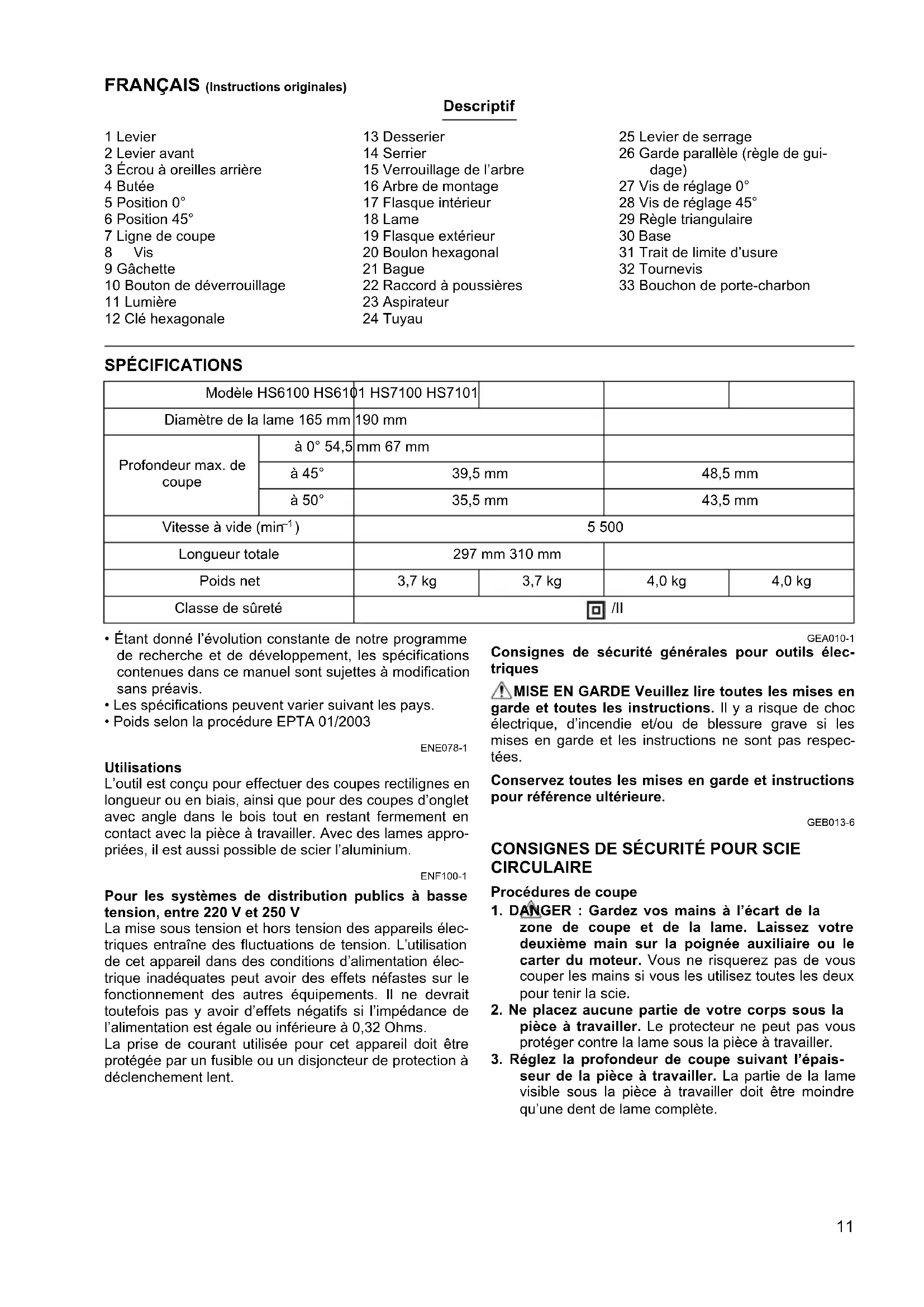 seur de la pièce à travailler. La partie de la lame visible sous la pièce à travailler doit être moindre qu’une dent de lame complète. Modèle HS6100 HS6101 HS7100 HS7101 Diamètre de la lame 165 mm 190 mm Profondeur max. de coupe à 0° 54,5 mm 67 mm à 45° 39,5 mm 48,5 mm à 50° 35,5 mm 43,5 mm Vitesse à vide (min