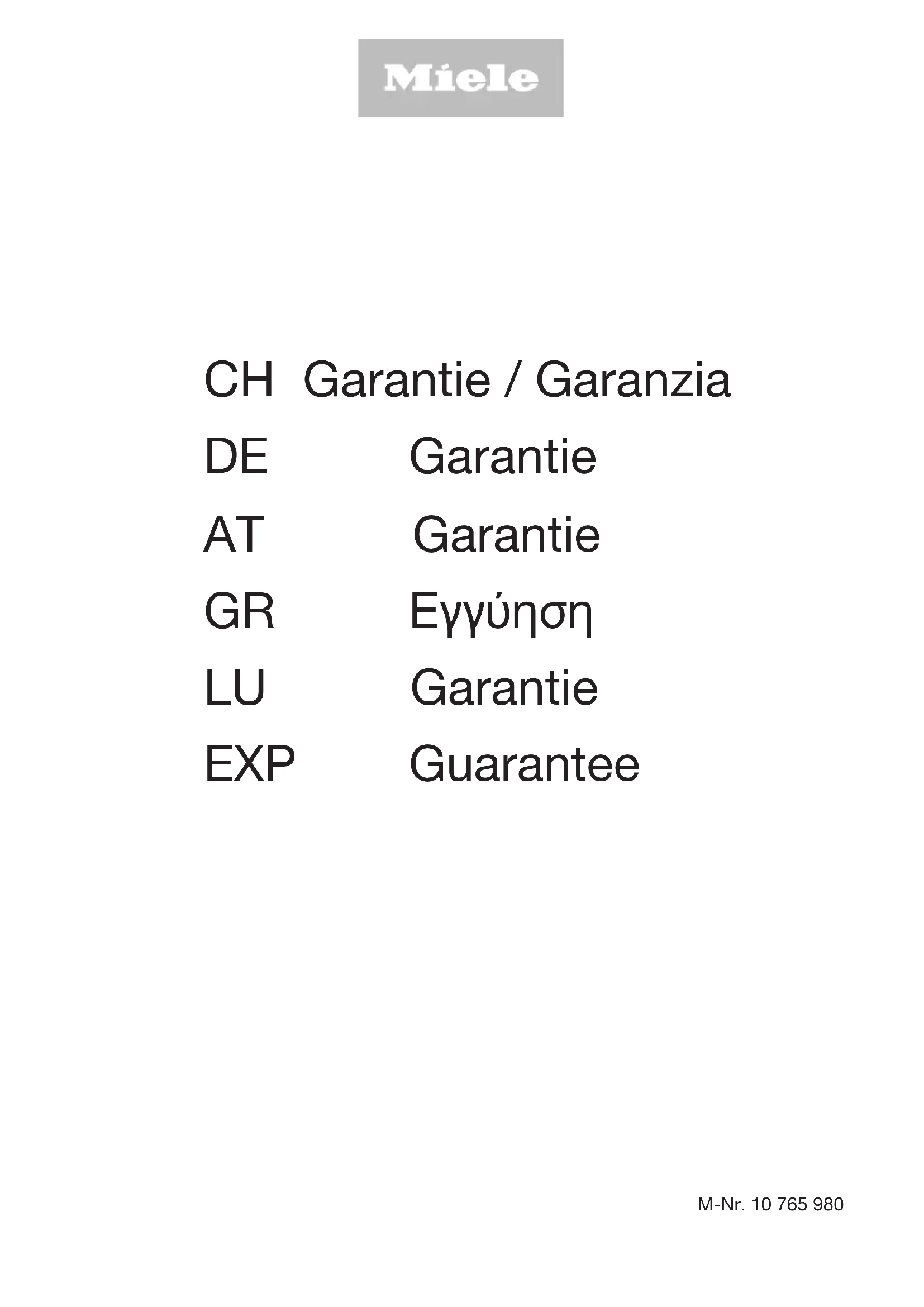 Les données personnelles ne seront utilisées qu'en vue du traitement de la demande ainsi que pour l'éventuelle application de la garantie, dans le respect des conditions régissant la protection des données. Les numéros de téléphone suivants sont valables uniquement en Suisse et dans la Principauté du Liechtenstein : CH Service Miele : 0 800 800 222 FL Service Miele : 0041 800 800 222 Adresse Internet: miele.ch/eservice MK/KD 07/11/2011 Garantie Suisse4 Certificato di garanzia Svizzera La ditta Miele SA, Svizzera accorda all'acquirente il diritto di garanzia sui nuovi apparecchi secondo le disposizioni sotto elencate, oltre ai diritti alle prestazioni di garanzia da parte del venditore senza limitarli.