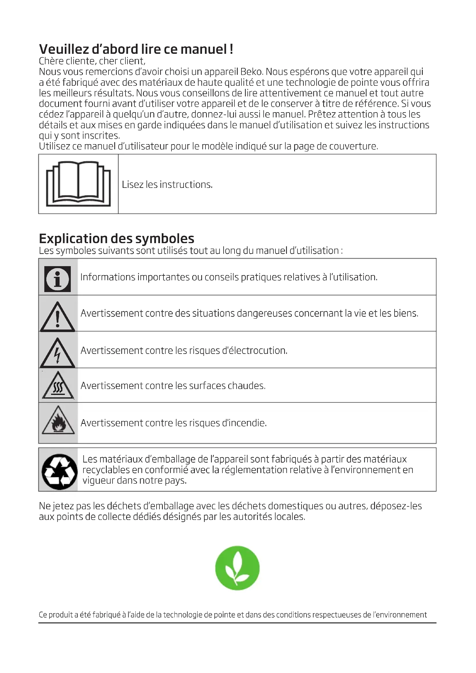 Avertissement contre les risques d'électrocution. Avertissement contre les surfaces chaudes. Avertissement contre les risques d'incendie. Les matériaux d’emballage de l’appareil sont fabriqués à partir des matériaux recyclables en conformié avec la réglementation relative à l’environnement en vigueur dans notre pays. Ne jetez pas les déchets d’emballage avec les déchets domestiques ou autres, déposez-les aux points de collecte dédiés désignés par les autorités locales. Ce produit a été fabriqué à l’aide de la technologie de pointe et dans des conditions respectueuses de l’environnementSèche-linge / Manuel de l’utilisateur 36 / FR 1 Consignes importantes en matière de sécurité et d'environnement Cette section comprend des consignes de sécurité qui aideront à vous protéger contre les blessures corporelles ou à éviter des dégâts matériels. Le non respect de ces consignes annulera toute garantie.