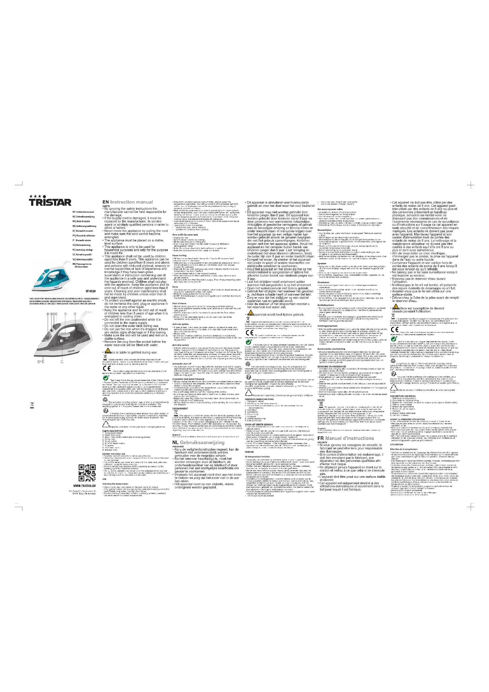 - Laissez toujours complètement refroidir le fer avant d’enrouler le cordon autour du patin. ENVIRONNEMENT Cet appareil ne doit pas être jeté avec les déchets ménagers à la fin de sa durée de vie, il doit être remis à un centre de recyclage pour les appareils électriques et électroniques. Ce symbole sur l'appareil, le manuel d'utilisation et l'emballage attire votre attention sur un point important. Les matériaux utilisés dans cet appareil sont recyclables. En recyclant vos appareils, vous contribuez de manière significative à la protection de notre environnement. Renseignez-vous auprès des autorités locales pour connaître les centres de collecte des déchets. Support Vous retrouvez toutes les informations et pièces de rechange sur www.tristar.eu! DEBedienungsanleitung SICHERHEIT