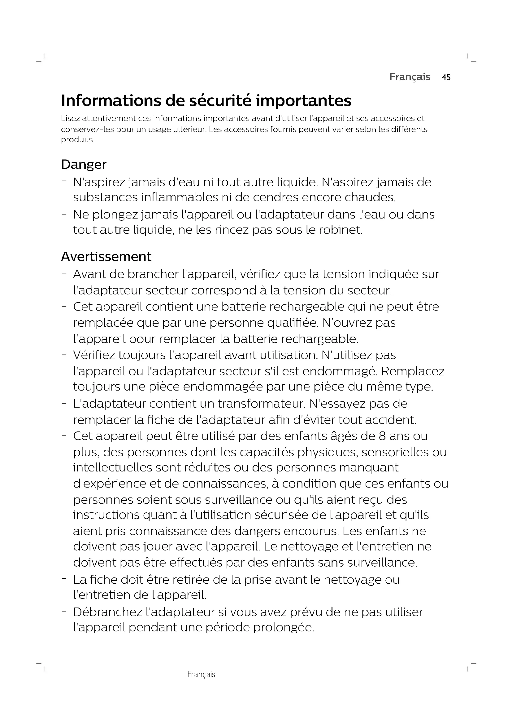 N'aspirez jamais d'eau ni tout autre liquide. N'aspirez jamais de substances inflammables ni de cendres encore chaudes.
