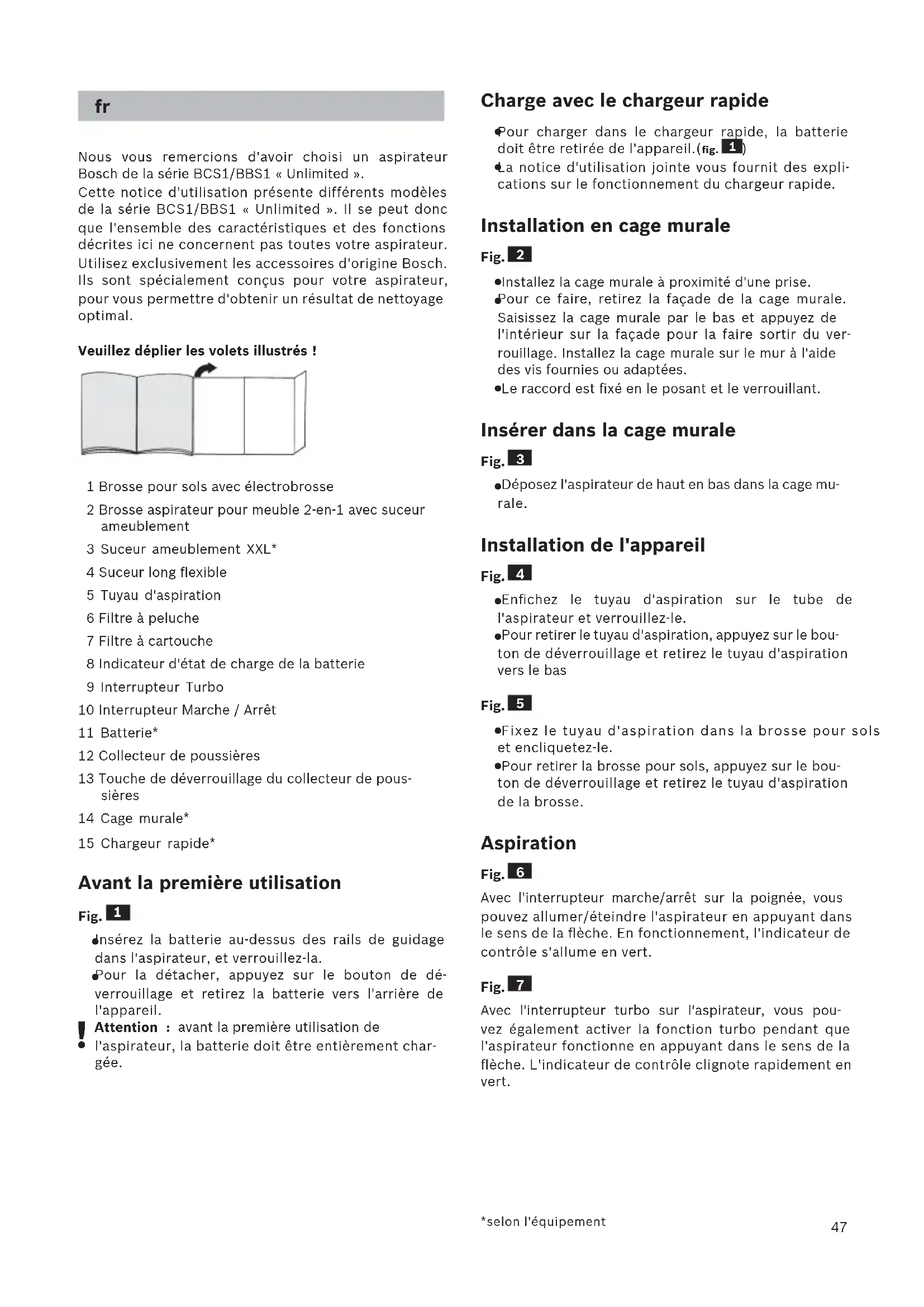 Caution: Do not use abrasive, glass-cleaning or all-purpose cleaning products. Never immerse the vacuum cleaner in water. Subject to technical modifications. Battery state indicator Operating status LED indicator Normal mode Green LED lit Turbo mode Green LED flashing quickly Battery capacity redu- ced by 20% Red LED flashing slowly Battery flat LED off Over-/undertemperature protection Red LED remains lit continuously for 10 se- conds, then goes out47 Nous vous remercions d'avoir choisi un aspirateur Bosch de la série BCS1/BBS1 « Unlimited ». Cette notice d'utilisation présente différents modèles de la série BCS1/BBS1 « Unlimited ». Il se peut donc que l'ensemble des caractéristiques et des fonctions décrites ici ne concernent pas toutes votre aspirateur. Utilisez exclusivement les accessoires d'origine Bosch. Ils sont spécialement conçus pour votre aspirateur, pour vous permettre d'obtenir un résultat de nettoyage optimal. Veuillez déplier les volets illustrés ! 1 Brosse pour sols avec électrobrosse 2 Brosse aspirateur pour meuble 2-en-1 avec suceur ameublement 3 Suceur ameublement XXL* 4 Suceur long flexible 5 Tuyau d'aspiration 6 Filtre à peluche 7 Filtre à cartouche 8 Indicateur d'état de charge de la batterie 9 Interrupteur Turbo 10 Interrupteur Marche / Arrêt 11 Batterie* 12 Collecteur de poussières 13 Touche de déverrouillage du collecteur de pous- sières 14 Cage murale* 15 Chargeur rapide* Avant la première utilisation Fig.