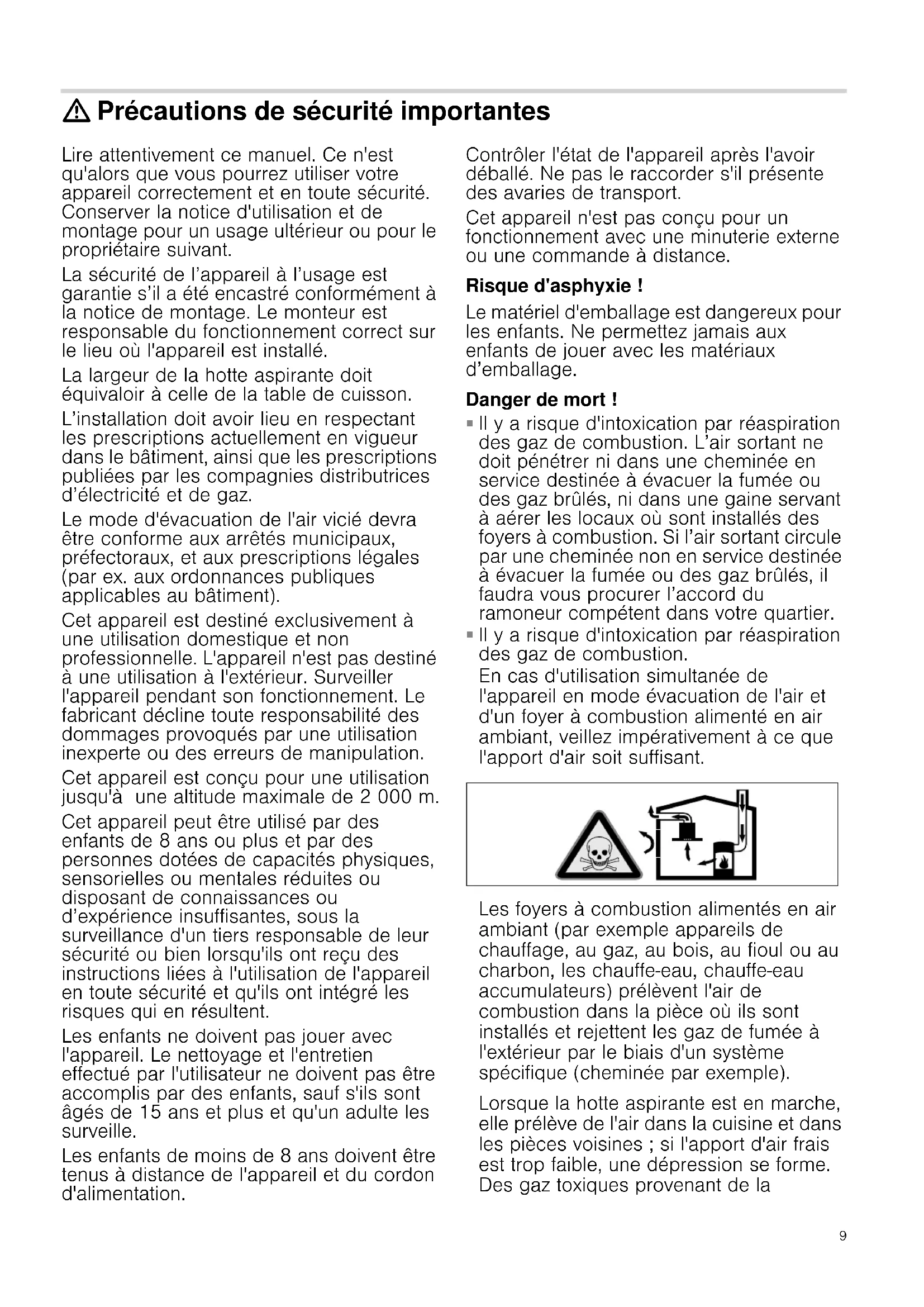 Il y a risque d'intoxication par réaspiration des gaz de combustion. En cas d'utilisation simultanée de l'appareil en mode évacuation de l'air et d'un foyer à combustion alimenté en air ambiant, veillez impérativement à ce que l'apport d'air soit suffisant. Les foyers à combustion alimentés en air ambiant (par exemple appareils de chauffage, au gaz, au bois, au fioul ou au charbon, les chauffe-eau, chauffe-eau accumulateurs) prélèvent l'air de combustion dans la pièce où ils sont installés et rejettent les gaz de fumée à l'extérieur par le biais d'un système spécifique (cheminée par exemple). Lorsque la hotte aspirante est en marche, elle prélève de l'air dans la cuisine et dans les pièces voisines ; si l'apport d'air frais est trop faible, une dépression se forme. Des gaz toxiques provenant de la10 cheminée ou du conduit d'évacuation sont réaspirés dans les pièces d'habitation.