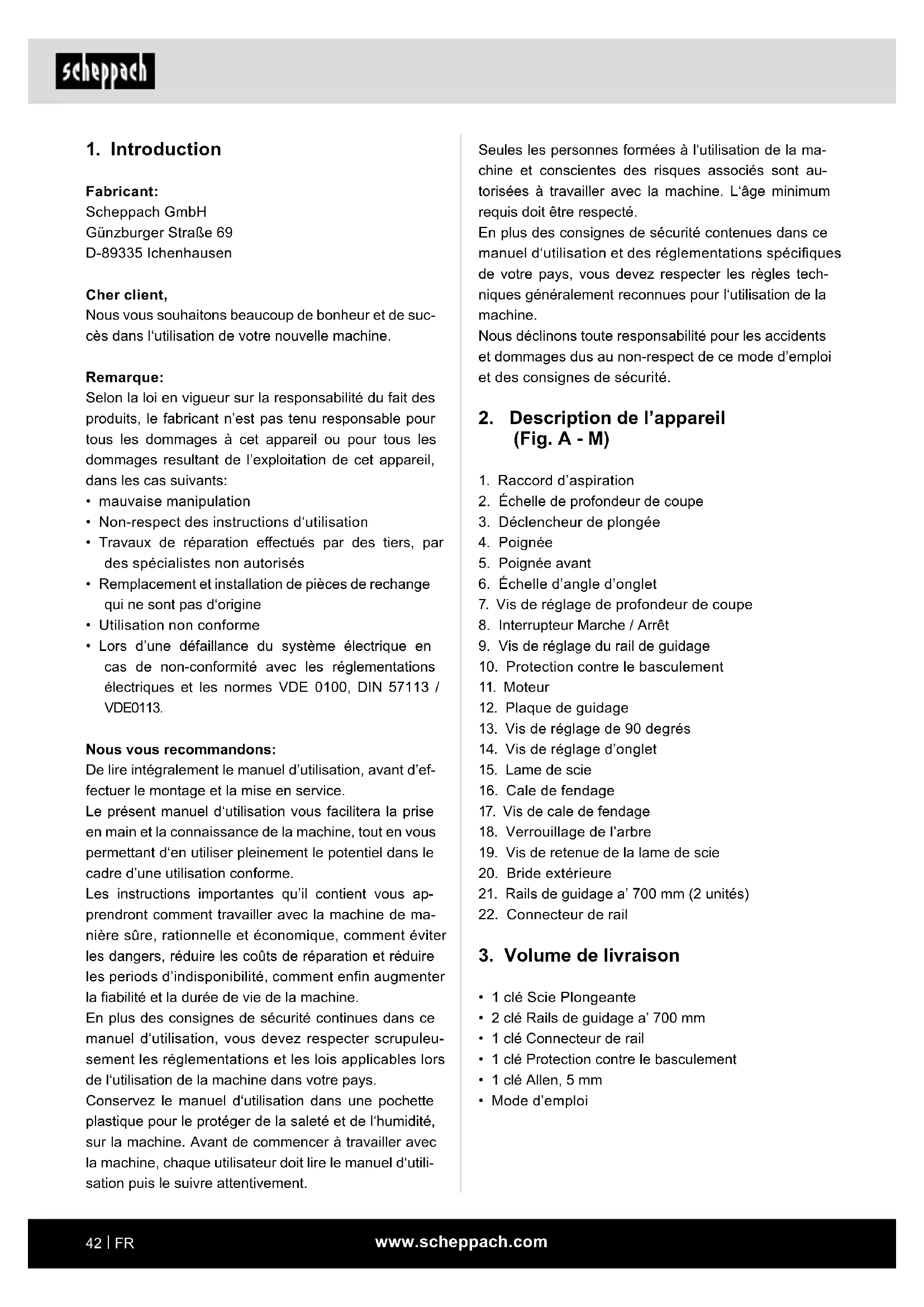 - Lors d’une défaillance du système électrique en cas de non-conformité avec les réglementations électriques et les normes VDE 0100, DIN 57113 / VDE0113. Nous vous recommandons: De lire intégralement le manuel d’utilisation, avant d’ef- fectuer le montage et la mise en service. Le présent manuel d‘utilisation vous facilitera la prise en main et la connaissance de la machine, tout en vous permettant d‘en utiliser pleinement le potentiel dans le cadre d’une utilisation conforme. Les instructions importantes qu’il contient vous ap- prendront comment travailler avec la machine de ma- nière sûre, rationnelle et économique, comment éviter les dangers, réduire les coûts de réparation et réduire les periods d’indisponibilité, comment enn augmenter la abilité et la durée de vie de la machine. En plus des consignes de sécurité continues dans ce manuel d‘utilisation, vous devez respecter scrupuleu- sement les réglementations et les lois applicables lors de l‘utilisation de la machine dans votre pays. Conservez le manuel d‘utilisation dans une pochette plastique pour le protéger de la saleté et de l‘humidité, sur la machine. Avant de commencer à travailler avec la machine, chaque utilisateur doit lire le manuel d‘utili- sation puis le suivre attentivement.www.scheppach.com