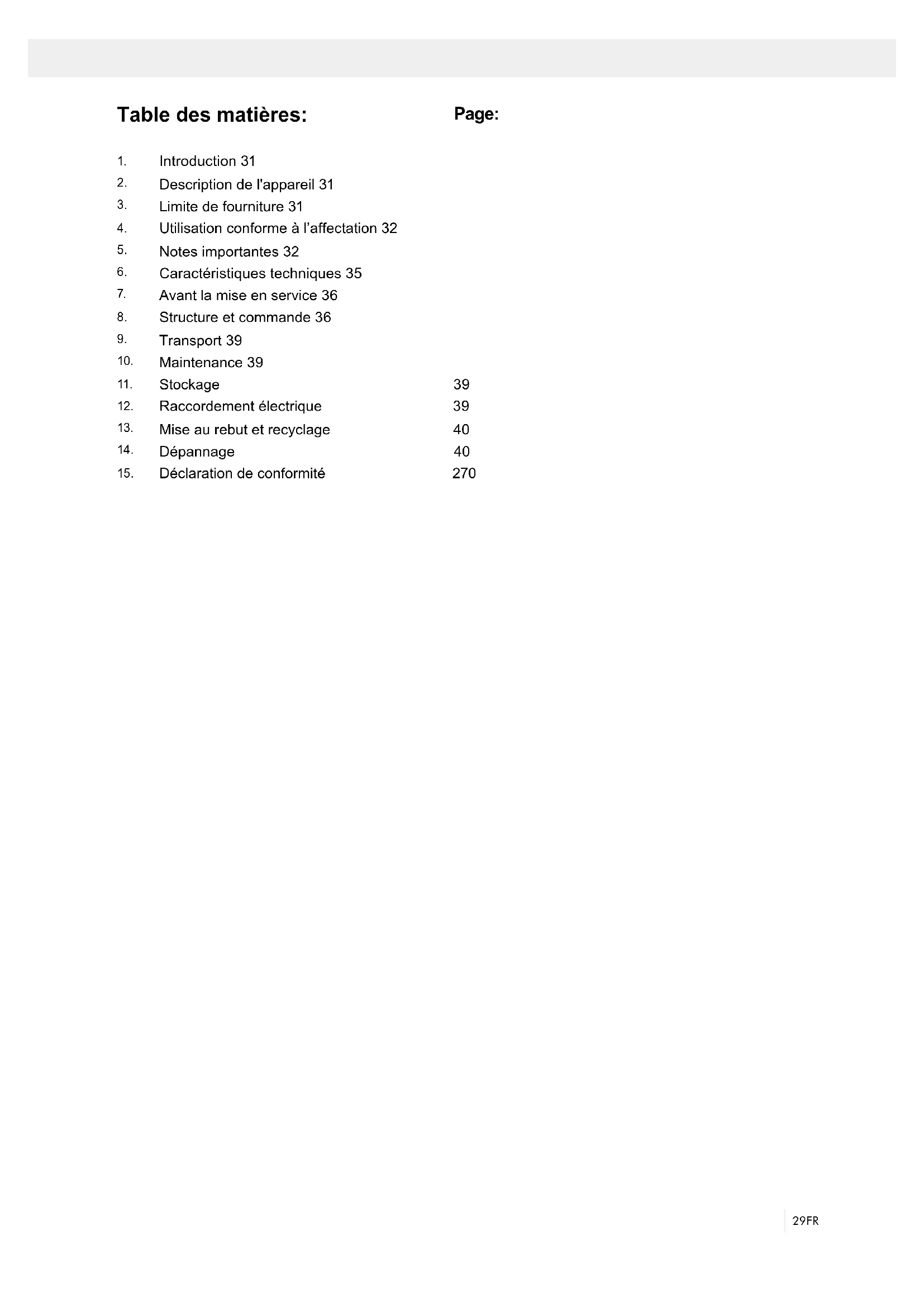 - Lors d’une défaillance du système électrique en cas de non-conformité avec les réglementations électriques et les normes VDE 0100, DIN 57113 / VDE0113. NOUS VOUS RECOMMANDONS: De lire intégralement le manuel d’utilisation, avant d’ef- fectuer le montage et la mise en service. Le présent manuel d‘utilisation vous facilitera la prise en main et la connaissance de la machine, tout en vous permettant d‘en utiliser pleinement le potentiel dans le cadre d’une utilisation conforme. Les instructions impor- tantes qu’il contient vous apprendront comment travailler avec la machine de manière sûre, rationnelle et écono- mique ; comment éviter les dangers, réduire les coûts de réparation et réduire les periods d’indisponibilité ; com- ment enn augmenter la abilité et la durée de vie de la machine. En plus des consignes de sécurité continues dans ce manuel d‘utilisation, vous devez respecter scru- puleusement les réglementations et les lois applicables lors de l‘utilisation de la machine dans votre pays. Conservez le manuel d‘utilisation dans une pochette plastique pour le protéger de la saleté et de l‘humidité, sur la machine. Avant de commencer à travailler avec la machine, chaque utilisateur doit lire le manuel d‘utilisa- tion puis le suivre attentivement. Seules les personnes formées à l‘utilisation de la machine et conscientes des risques associés sont autorisées à travailler avec la ma- chine. L‘âge minimum requis doit être respecté.32 FR